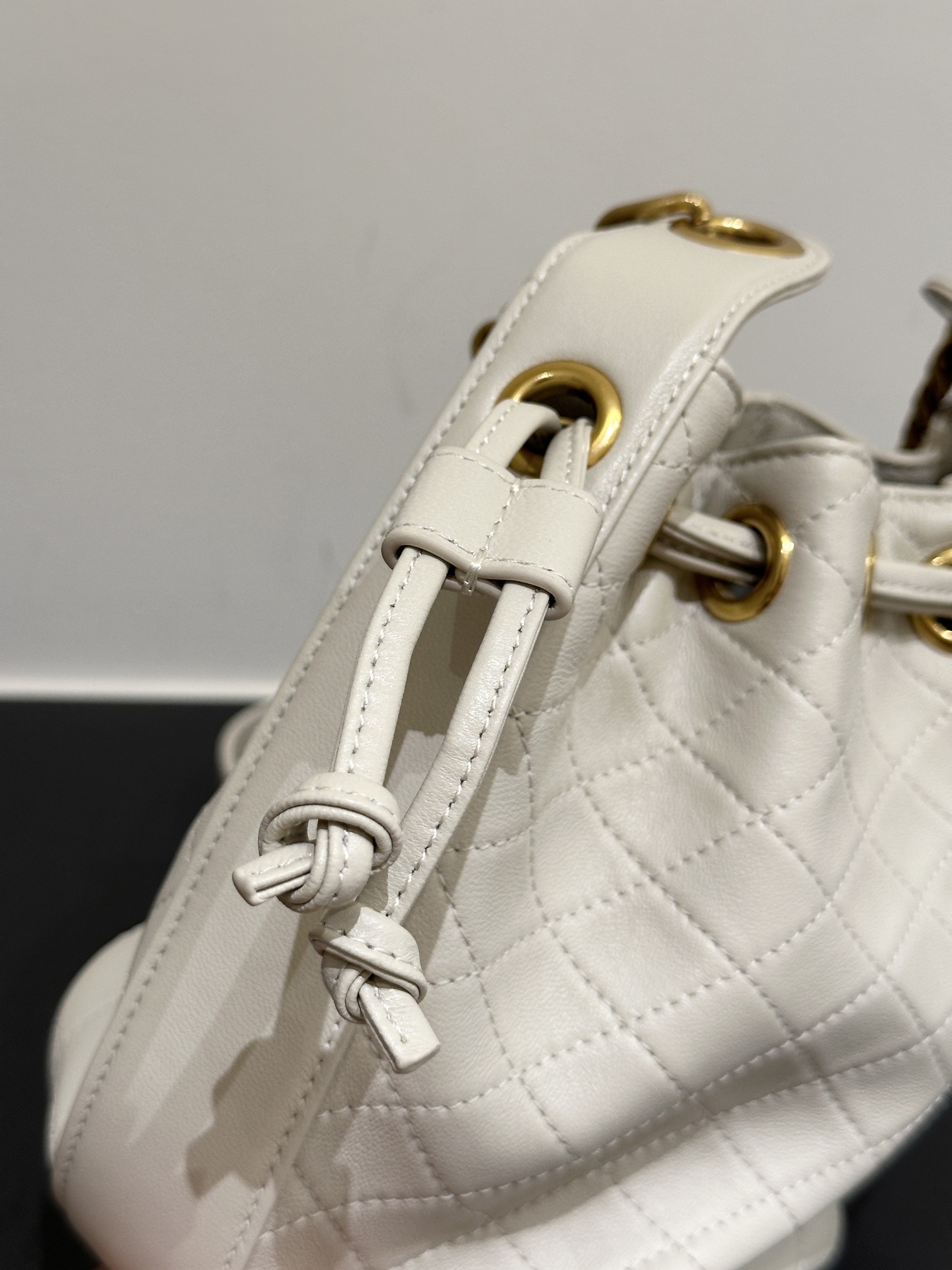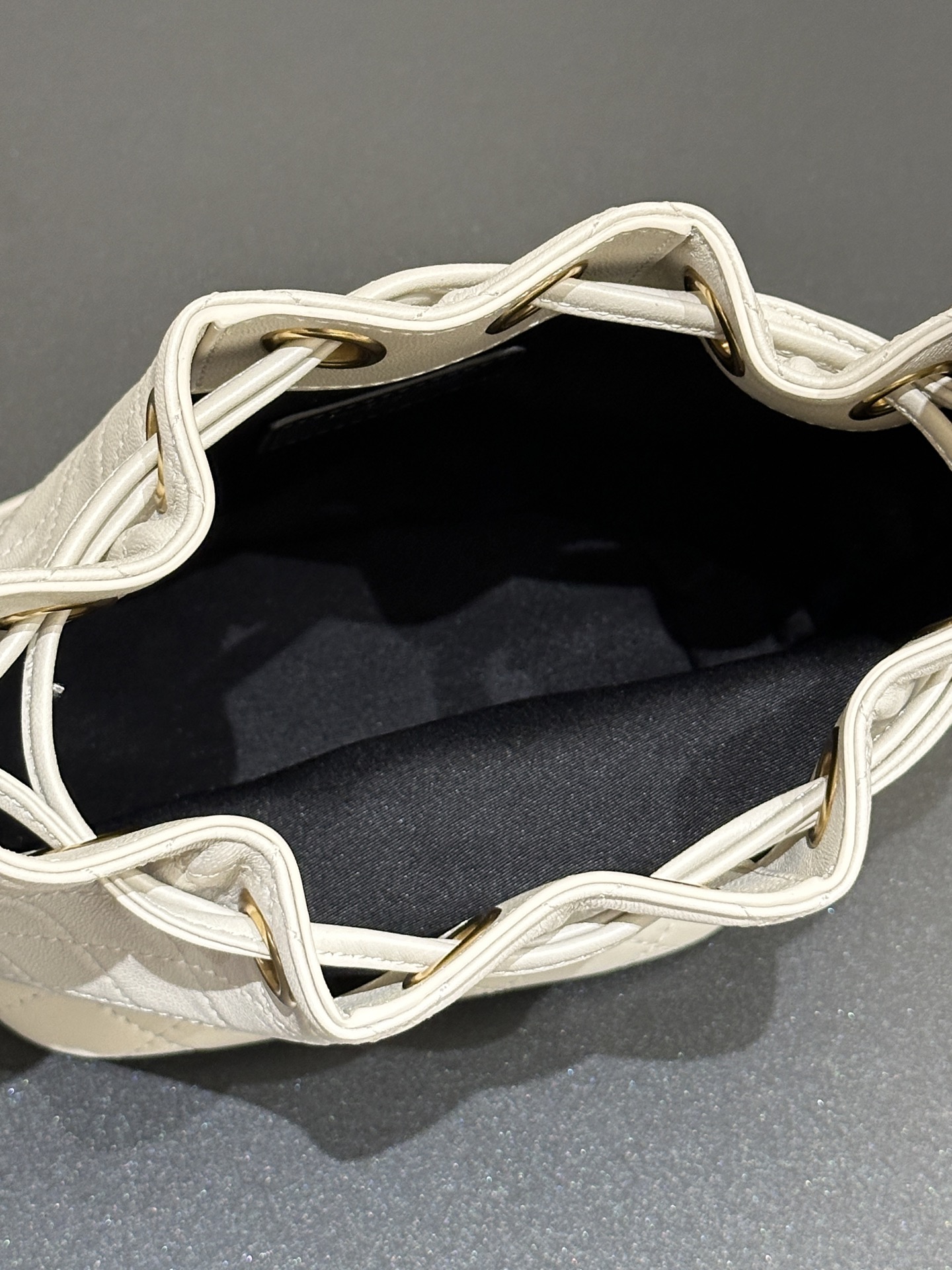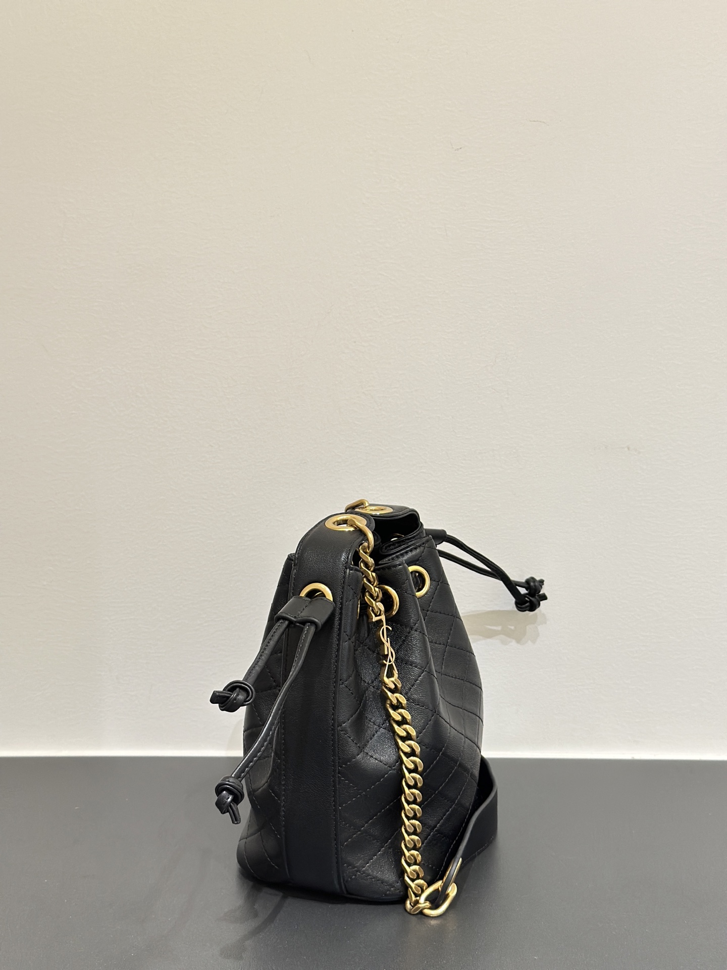 索繩開合設計搭配復古鏈條與皮質肩帶,背起來不僅舒適輕盈,還能自然地襯托出氣質與品味。這款包包的精工設計,讓每一次出門都能感受到奢侈品的魅力。