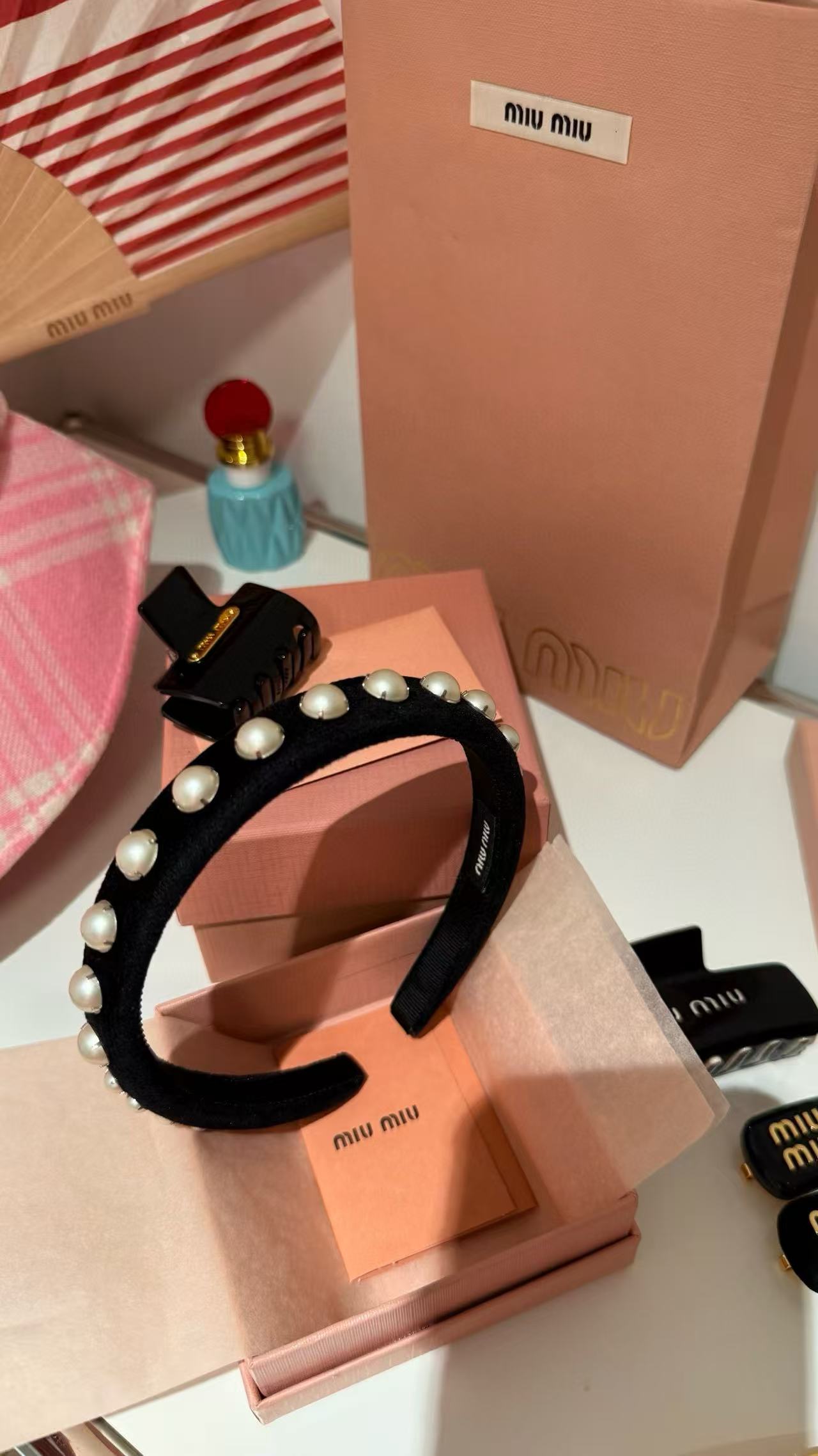2025早秋 MIU MIU 黑色天鵝絨大顆珍珠髮箍 精品 A貨:貴氣優雅,千金必備