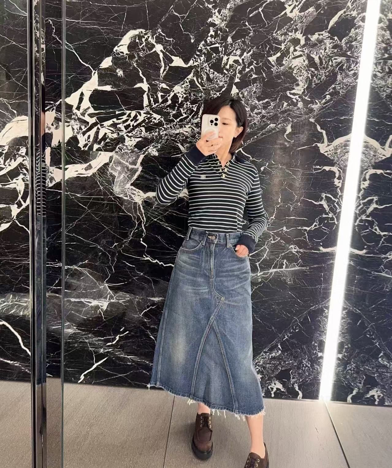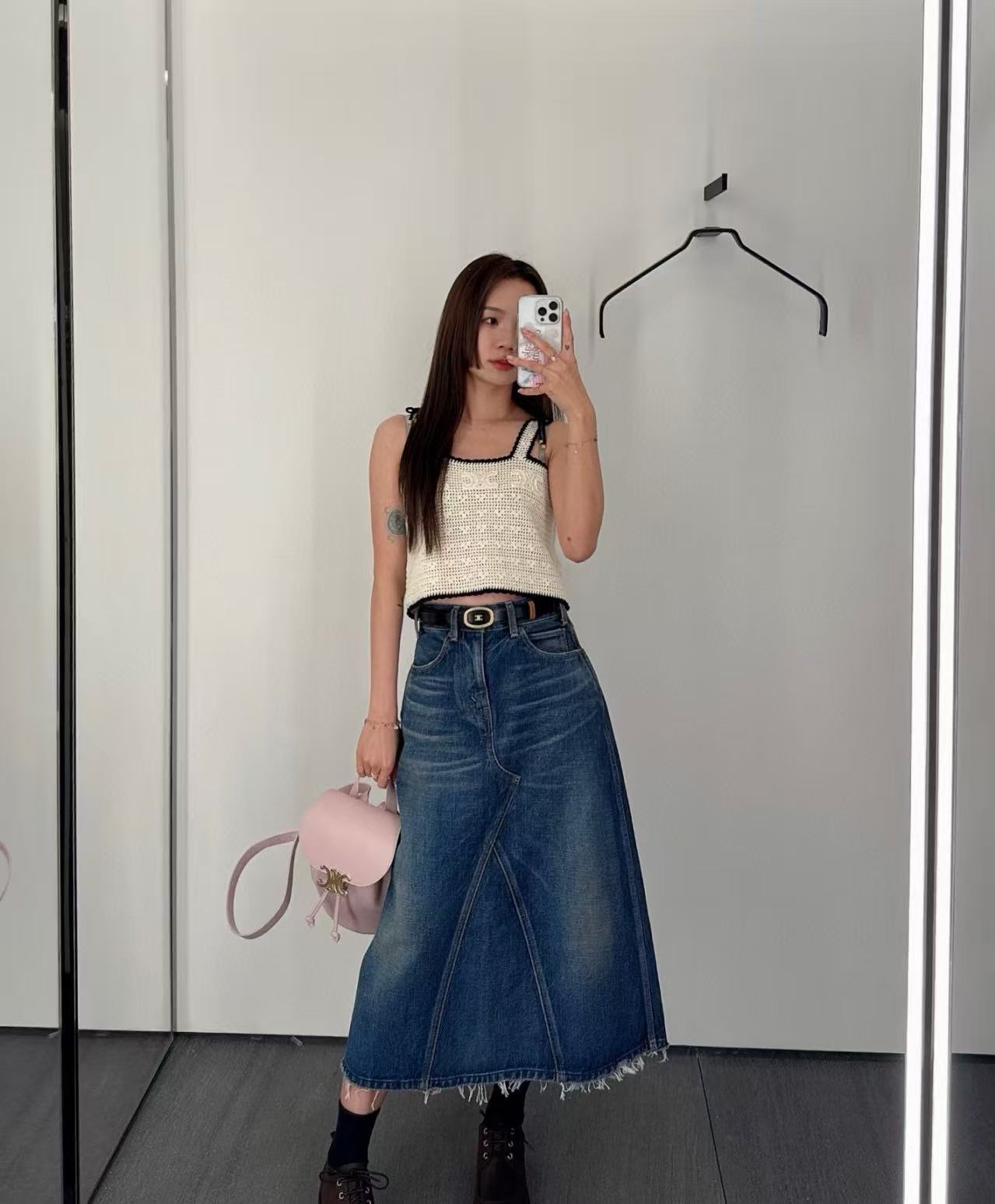 秋冬層次感:搭配厚針織毛衣或西裝外套,再加短靴,溫暖又有型,輕鬆打造時髦層次感。這款復刻的假開衩牛仔裙,設計靈感來自於奢侈品品牌的經典範本,讓你在日常穿搭中也能感受到時尚的精工質感。