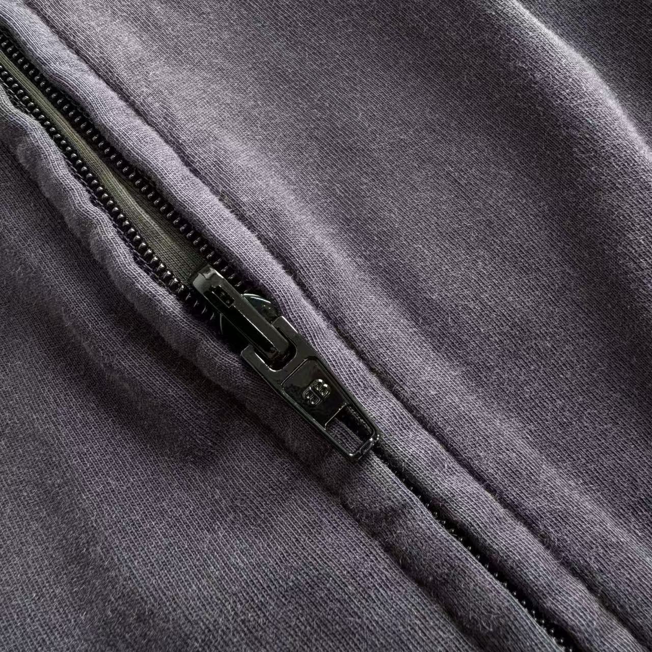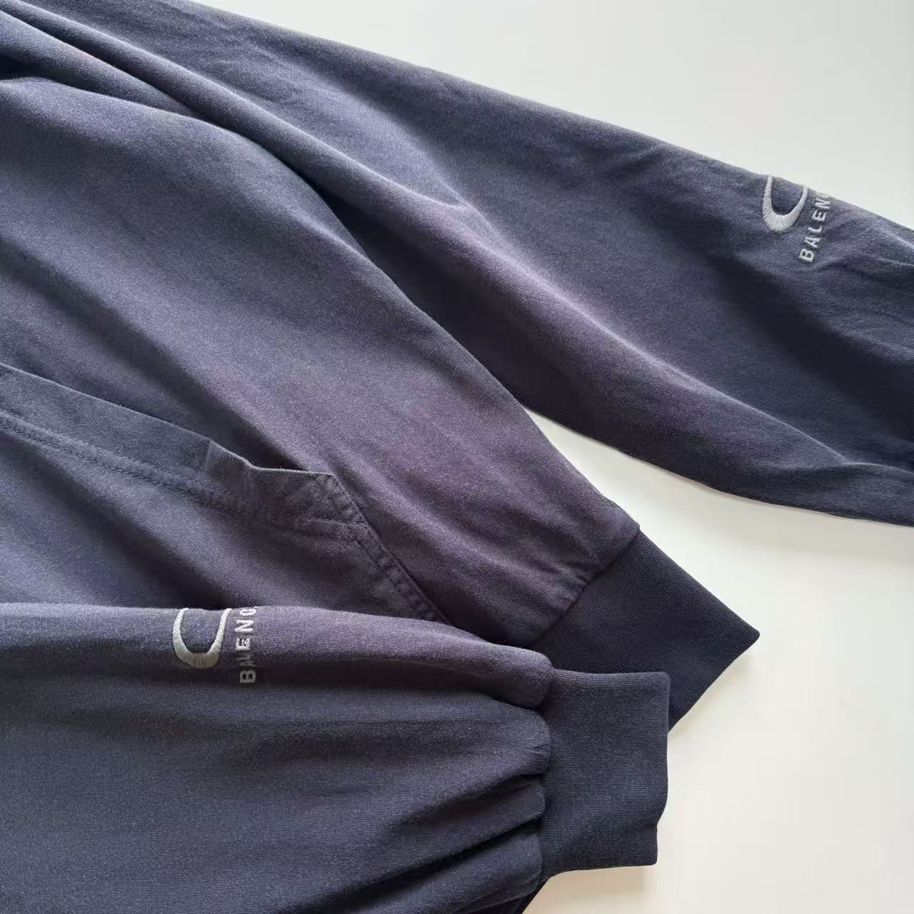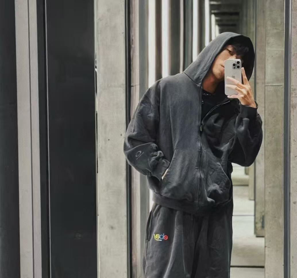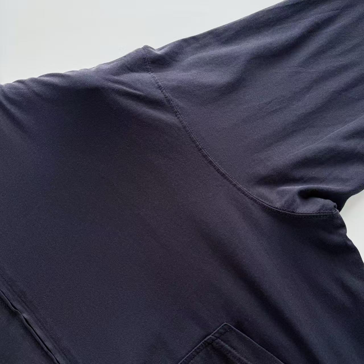 做舊部分更是一絕——控制性石磨+酶洗,精準剝除深色基底的部分染料,留下自然不均的褪色痕跡,灰度柔和復古,完全是那種「穿過十年」的老味,卻又乾淨不髒。