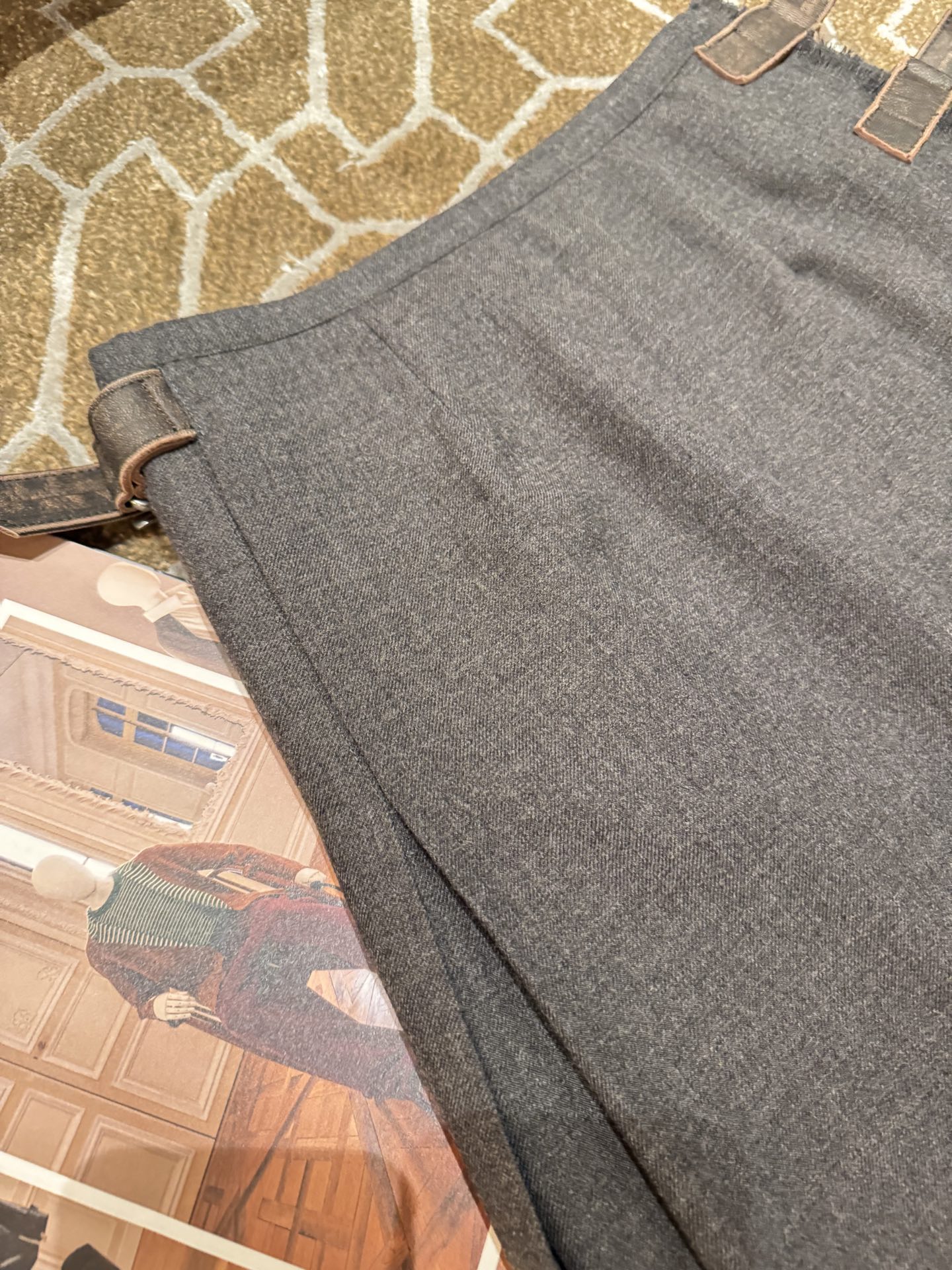 皮扣部分使用小羊皮經過做舊洗水處理,柔軟卻有韌性,細節質感非常出眾。這樣的材質與工藝組合,讓整件裙子不僅穿起來舒適有型,更是秋冬質感的代表作。