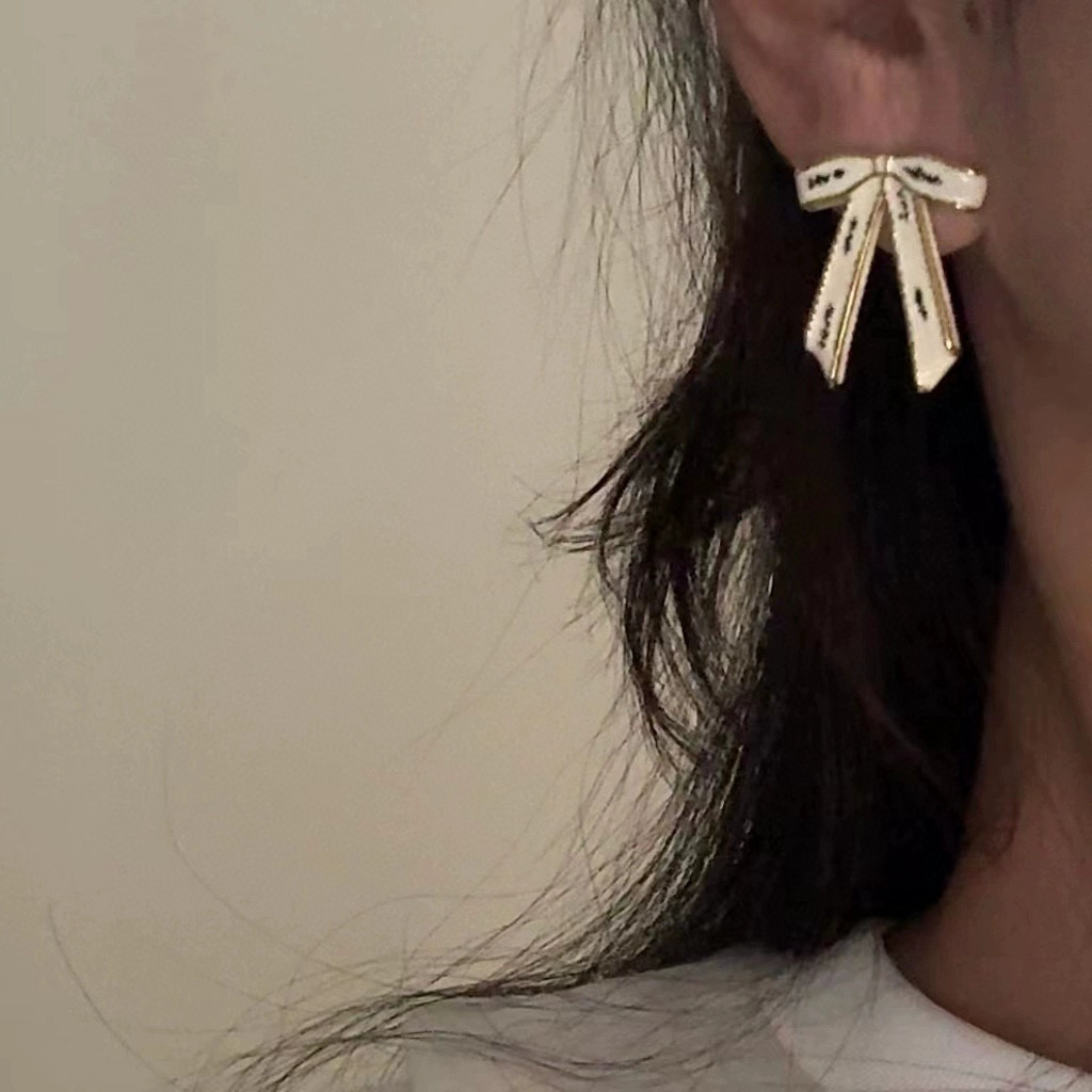 這款中古耳環真的美到心坎裡!白色絲帶蝴蝶結點綴上黑色字母,既俏皮又優雅,戴上瞬間氣質滿滿。