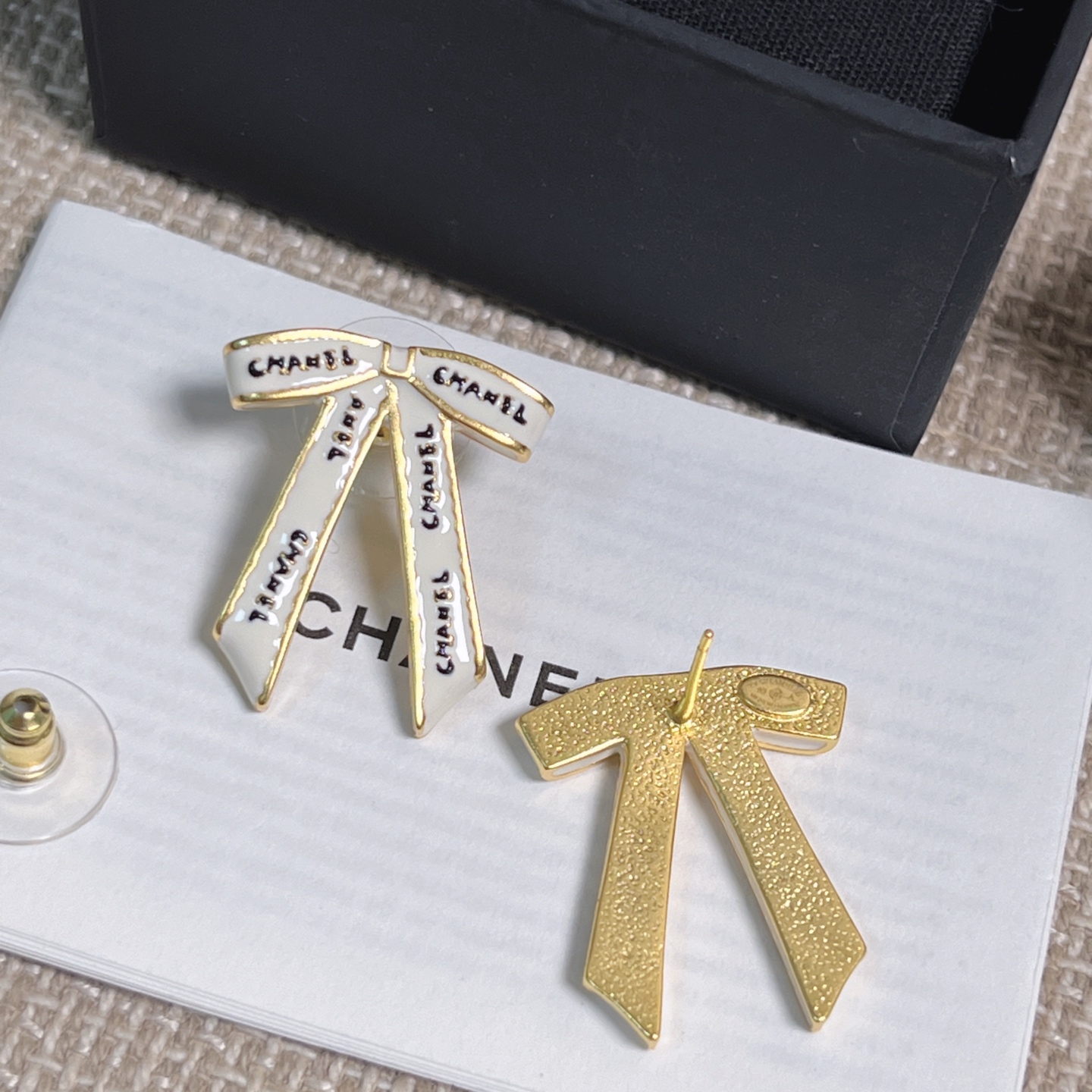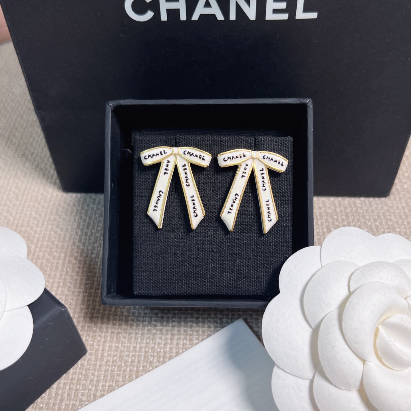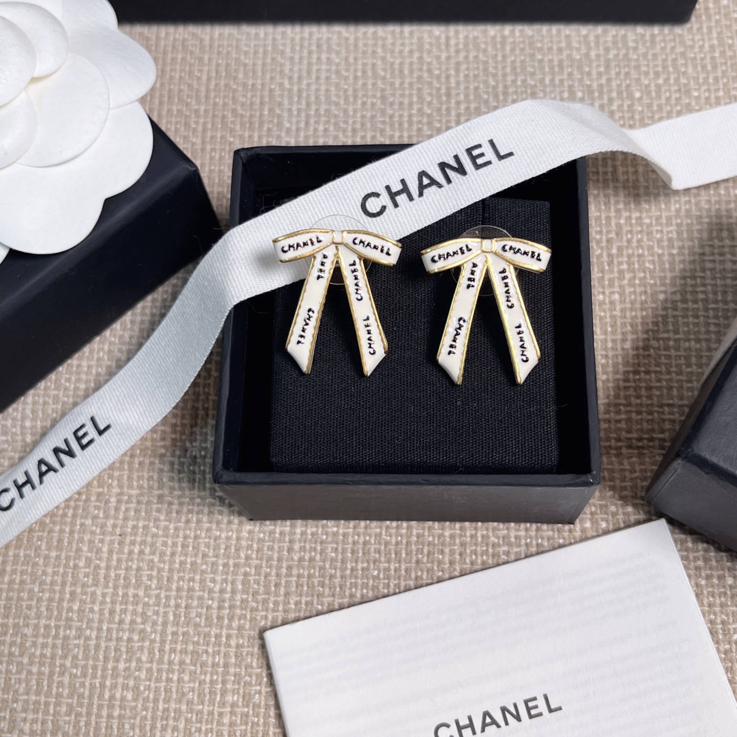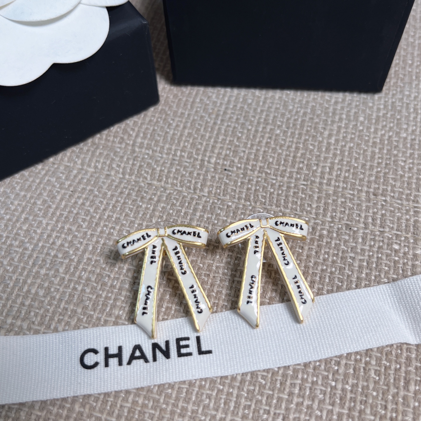 2025早秋新款 Chanel 黑字母白絲帶蝴蝶結耳環 精品 高仿