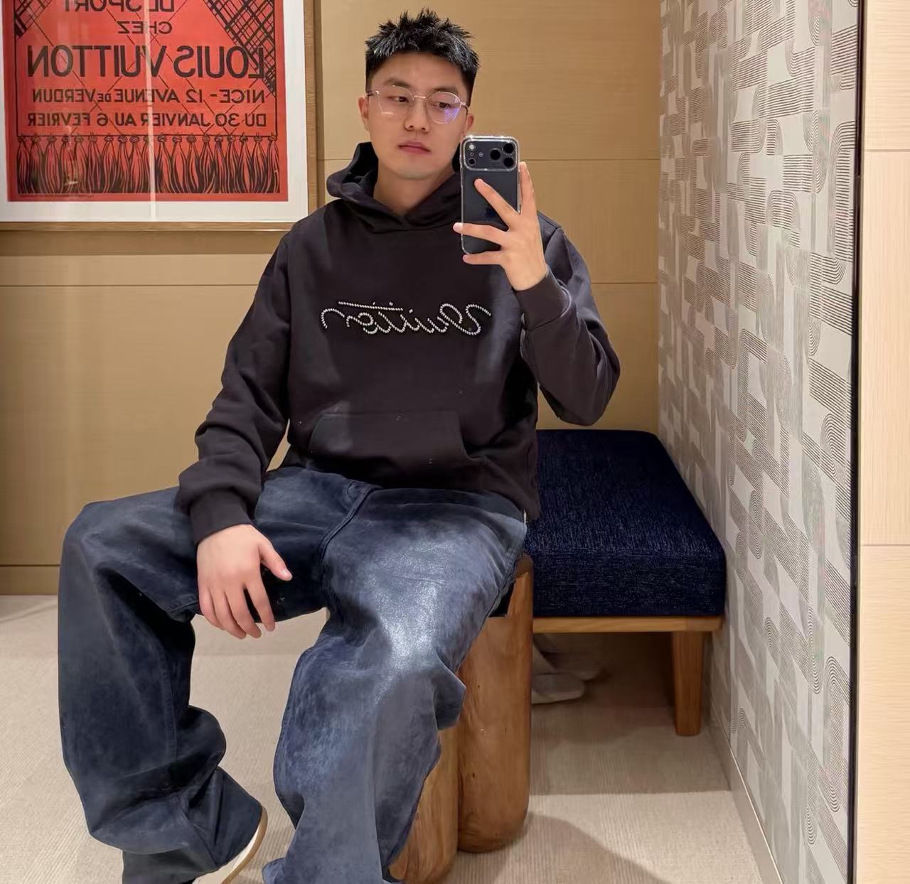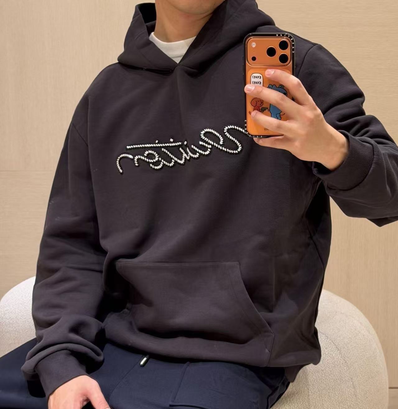 這絕對是2025秋冬最瘋「閃閃暴發戶」神器,遠看就是低調黑衛衣,近看胸前那排手寫體字母居然是一顆顆真珠粒繡出來的,在燈光下閃到整個房間都在發光,隨便一站就是全場最貴的那個,貴氣直接從胸口噴出來~