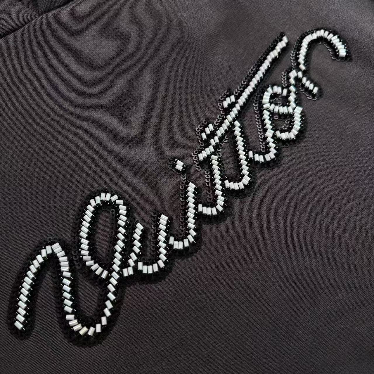 ・串珠刺繡工藝:胸前經典手寫體字母,100%真珠粒+繡線混繡,每顆珠子手工定位固定,立體感+閃度直接拉滿