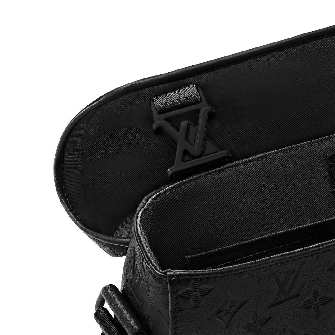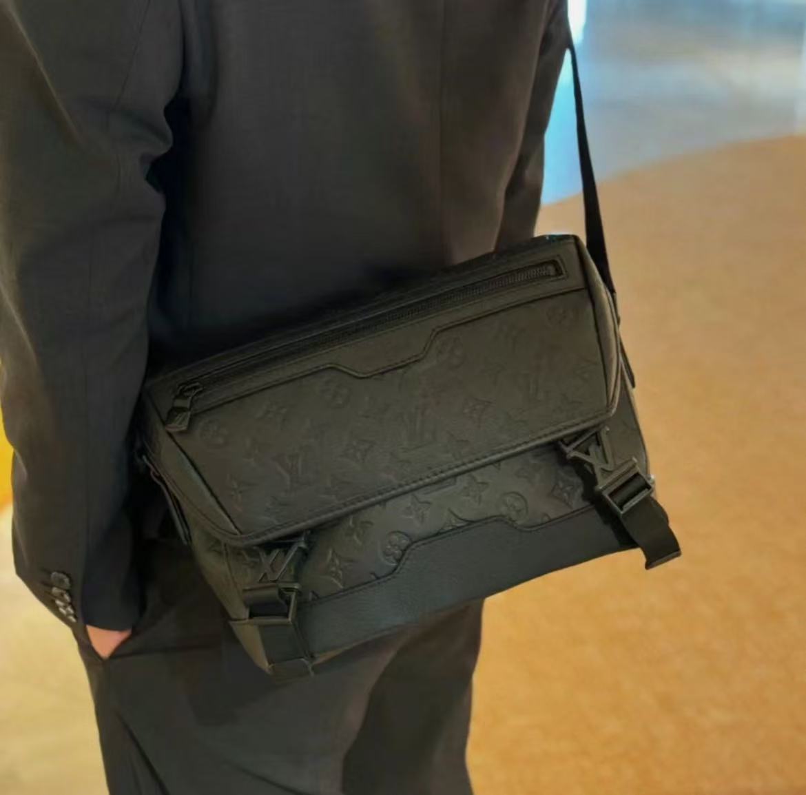 這款郵差包的材質真的非常講究!它使用了頂級的 Monogram Shadow 小牛皮製成,最特別的是它採用了低調奢華的條紋壓花工藝。這種壓紋讓經典的老花圖案以更內斂、更具金屬感紋理的方式呈現,充滿了沉穩的男性魅力,質感一眼可見!