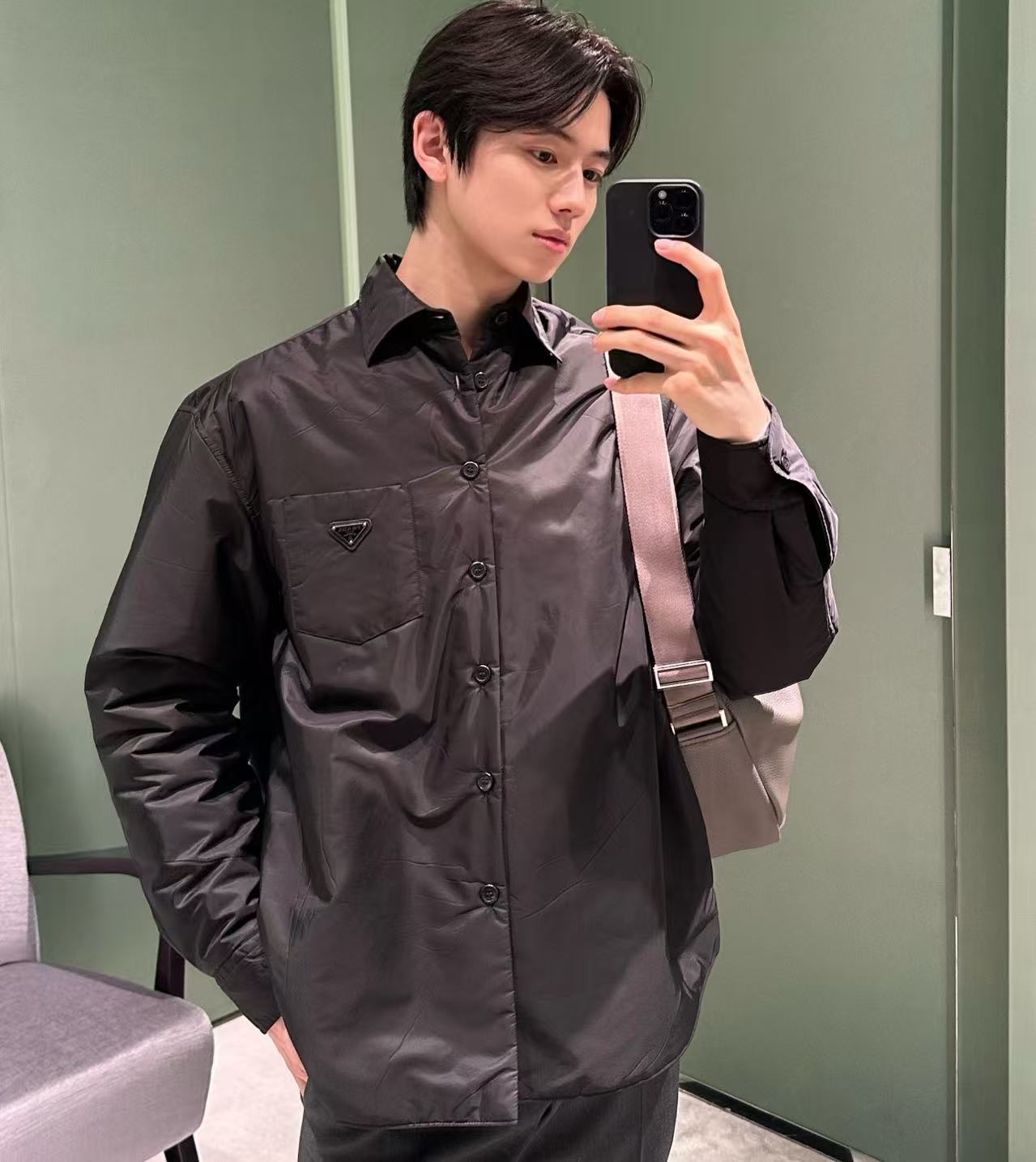 標誌性三角徽標:外套上飾有 Prada 標誌性的三角形徽標,一眼就能看出它的頂級身份,簡約卻充滿力量。