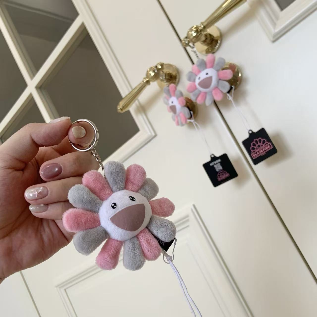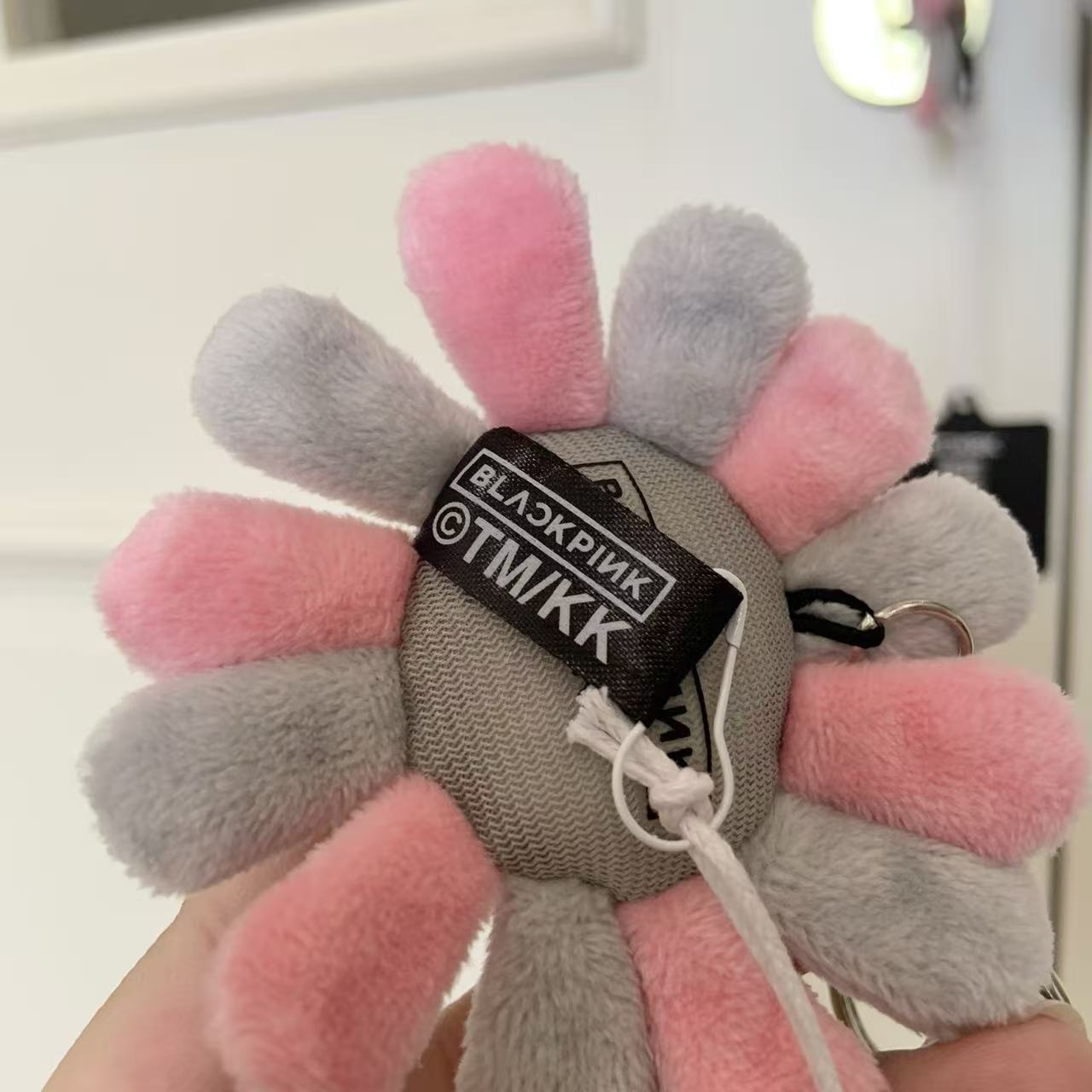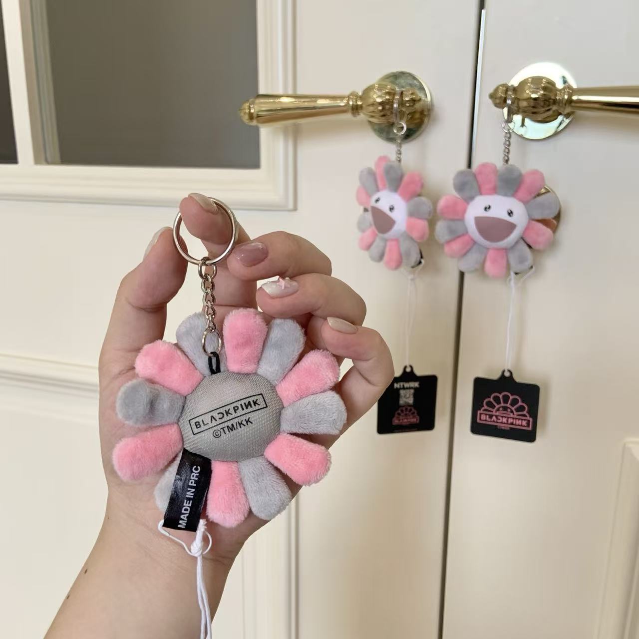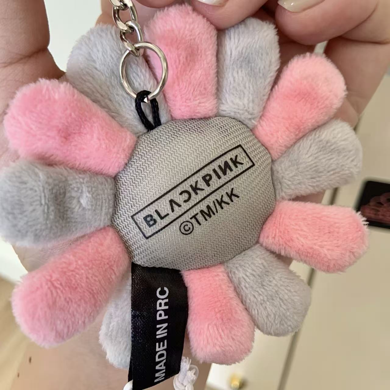 這個掛飾採用了村上隆經典的「太陽花」形象,並以灰粉配色呈現,完美地融合了 BLACKPINK 的甜酷風格與村上隆的童趣藝術。