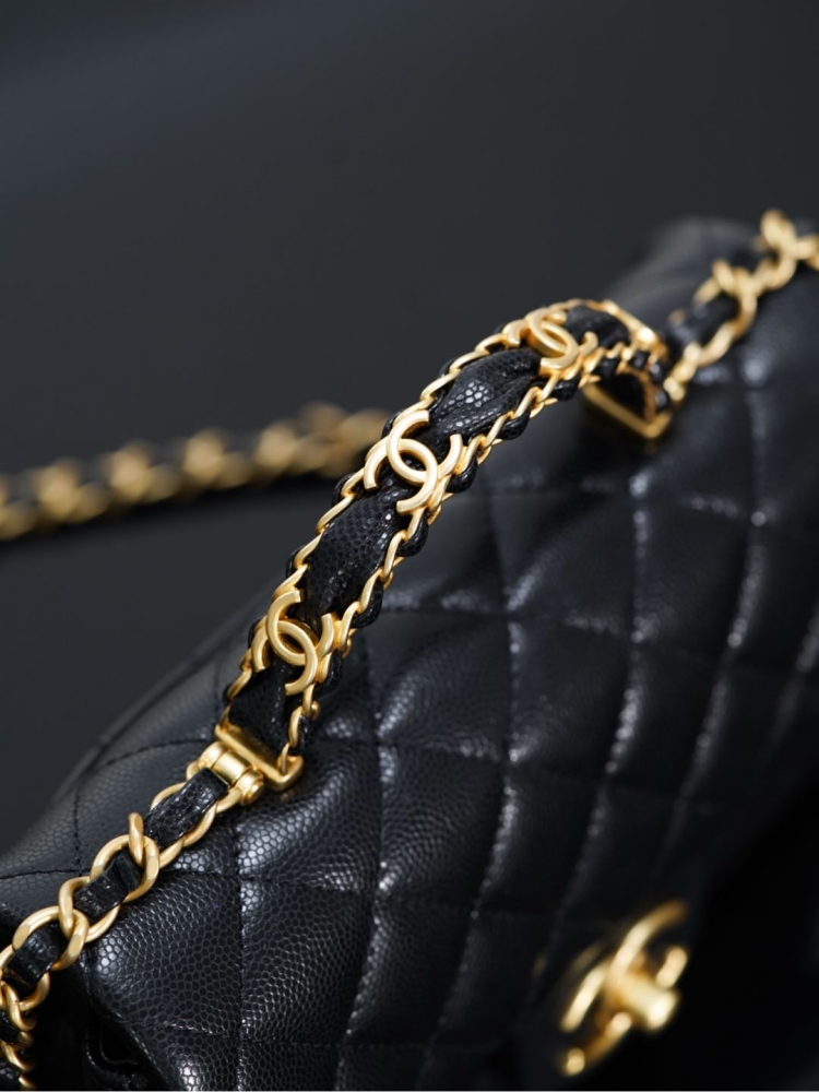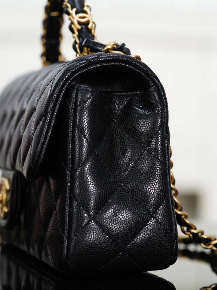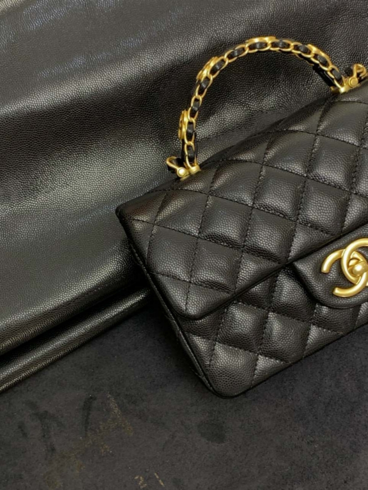 手柄上的雙C厚金設計,與皮革交織出的細節,不僅在外觀上極具辨識度,更在手提時帶來貼合掌心的舒適手感。長鏈條的設計能斜背、單肩背,多種背法自由切換,從日常到出席場合都能完美駕馭,絕對是一只百搭又經典的精品手袋。