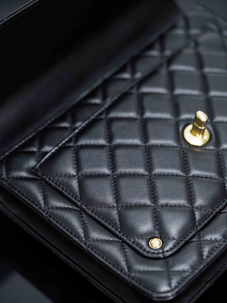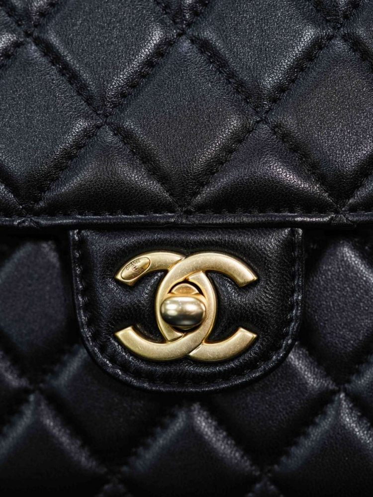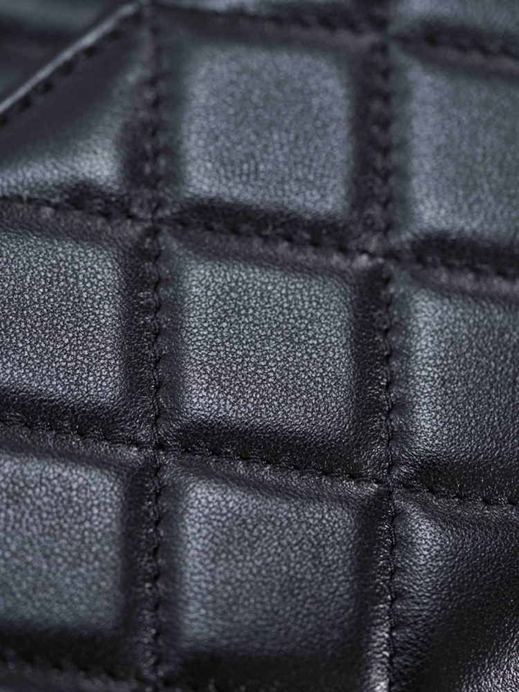 方正的廓形設計結合中古學院氛圍,搭配柔軟細膩的菱格紋小羊皮,既甜美又帶點酷颯感。黑金配色更是完美平衡了優雅與帥氣,讓整體造型一秒提升質感。