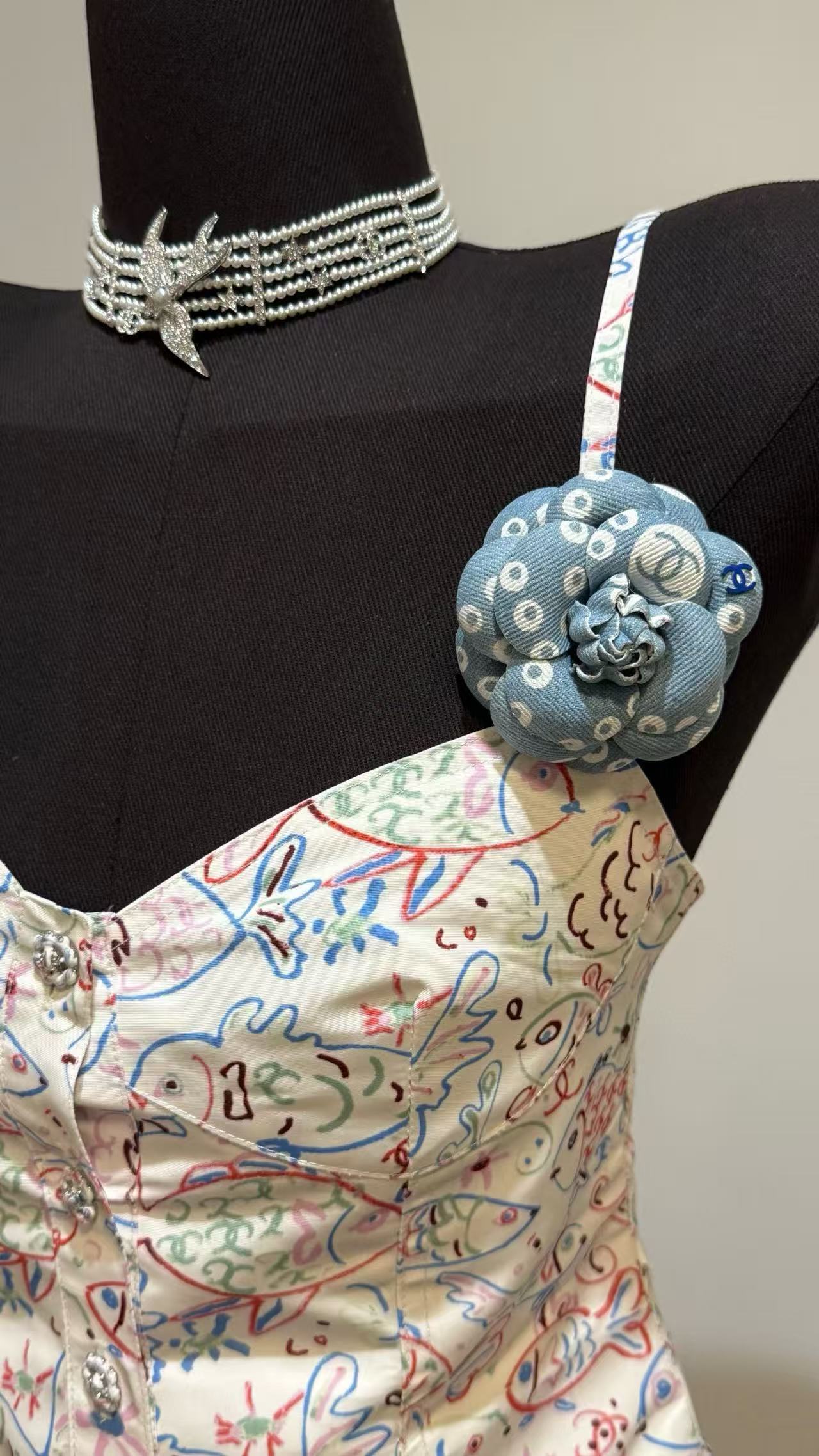 這款丹寧牛仔珍珠印花山茶花雙C胸針,以清新藍丹寧為基調,融合白色珍珠印花與標誌性山茶花及雙C設計,瞬間帶來復古濾鏡般的魅力。