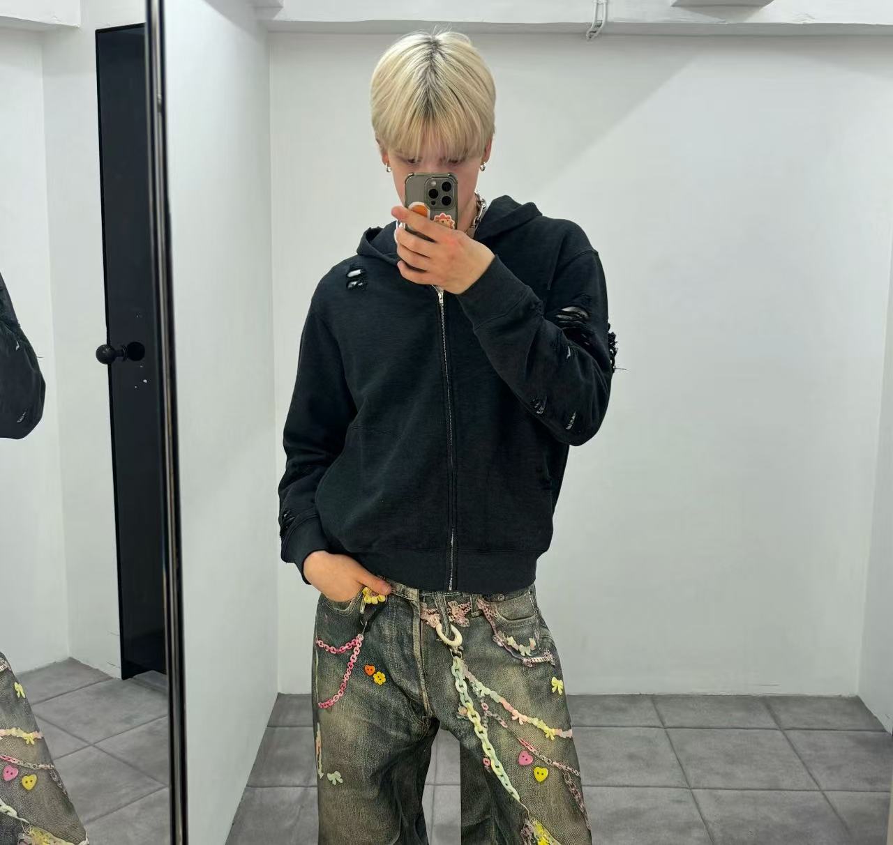 紐扣印花做舊拉鏈外套,版型俐落帶點街頭叛逆,灰藍基調低調又耐看,隨手一穿就是秋冬造型主角。這款外套在設計上融入了不少精品元素,讓人感受到時尚與奢侈品的碰撞。