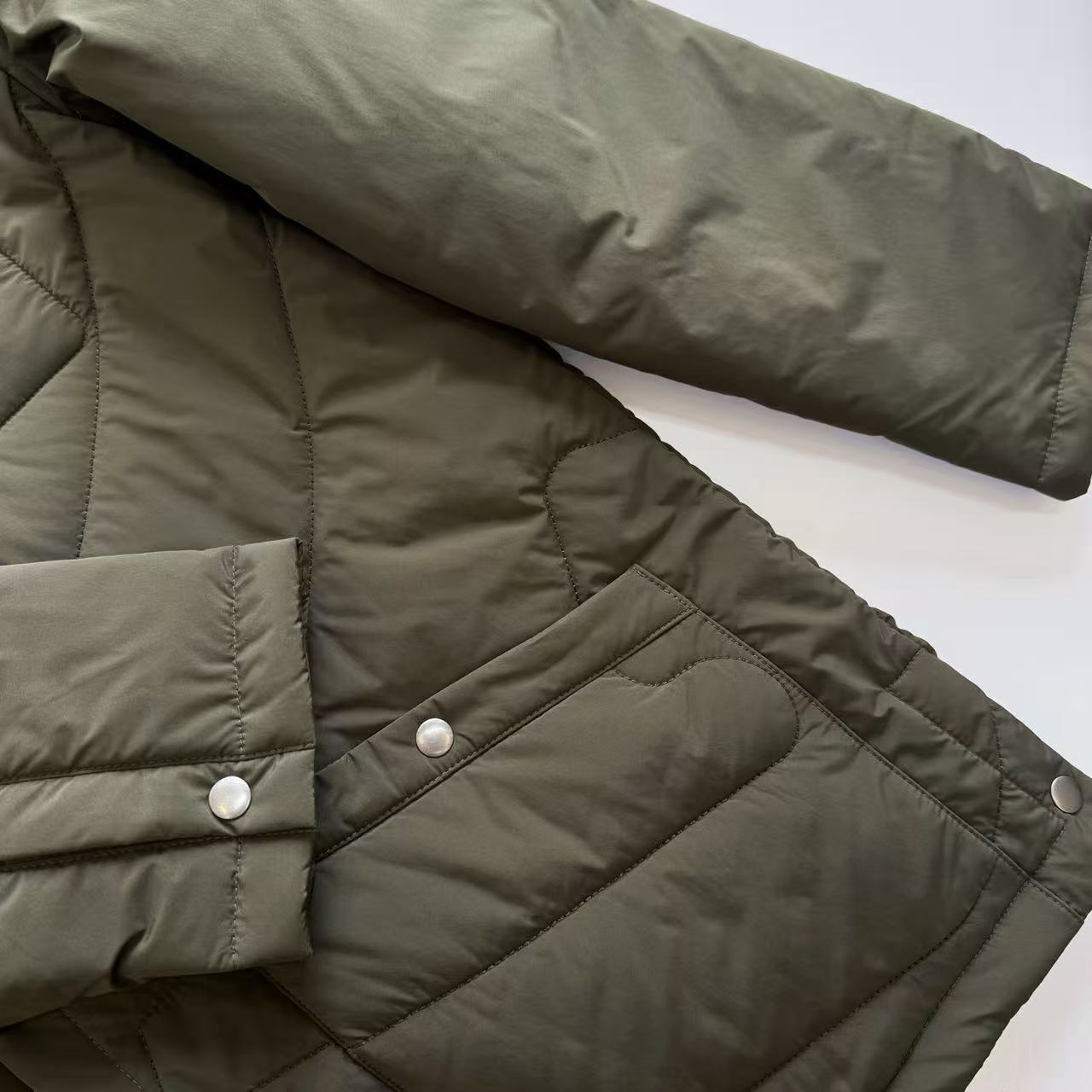 材料是超輕盈的100%聚酯纖維科技布,表面帶細微燈芯絨壓紋質感卻完全不重,裡面只有薄薄一層保暖襯墊,卻因為精密绗縫把填充物完全鎖死,穿起來暖而不腫、輕到像穿一件厚毛衣!版型是經典挺拔短身剪裁,肩線俐落、腰身微收,內搭西裝、外搭大衣都不鼓包,顯瘦顯高直接開掛~