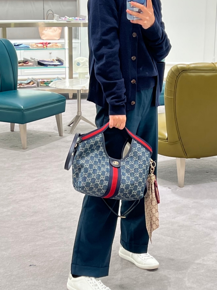 整體採用帆布製成,提供棕色與藍色兩種配色選擇。帆布材質本身兼具耐用與輕便的特性,能長時間使用而不易變形。丹寧的紋理搭配 GG 經典花紋,更增添了細節上的層次感,耐看又耐背。而它的設計與原單的風格非常接近,讓人不由得想要擁有。