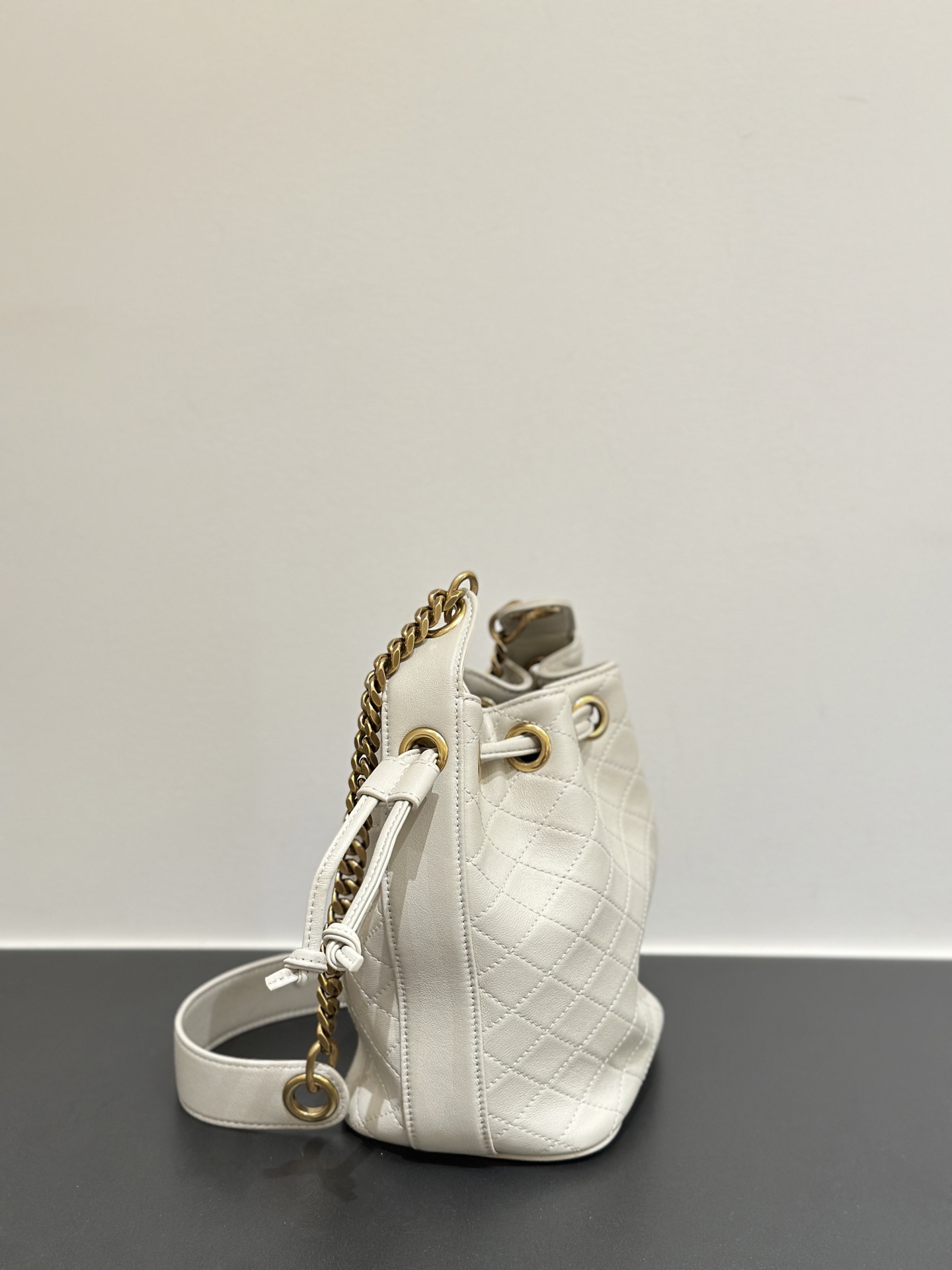 索繩開合設計搭配復古鏈條與皮質肩帶,背起來不僅舒適輕盈,還能自然地襯托出氣質與品味。這款包包的精工設計,讓每一次出門都能感受到奢侈品的魅力。