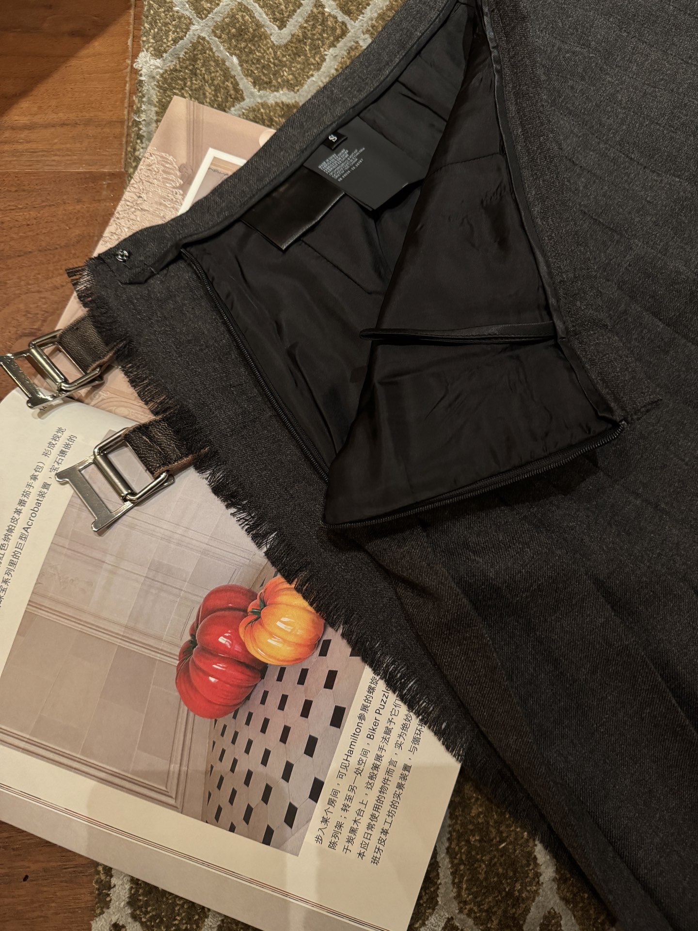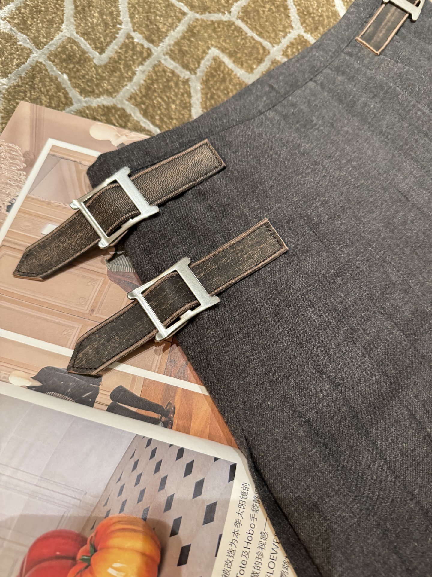 皮扣部分使用小羊皮經過做舊洗水處理,柔軟卻有韌性,細節質感非常出眾。這樣的材質與工藝組合,讓整件裙子不僅穿起來舒適有型,更是秋冬質感的代表作。