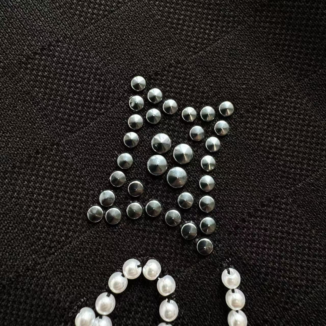 這件短袖最吸引人的地方就是它胸前的珠飾刺繡與鉚釘工藝結合圖案!這種工藝非常複雜,透過珠飾刺繡,讓圖案層次清晰,立體感超強;再結合鉚釘印花工藝,將金屬鉚釘按照圖案的形狀進行排列和固定。這樣的精工設計,讓整件上衣充滿了藝術感,也完美展現了品牌的工藝水準。