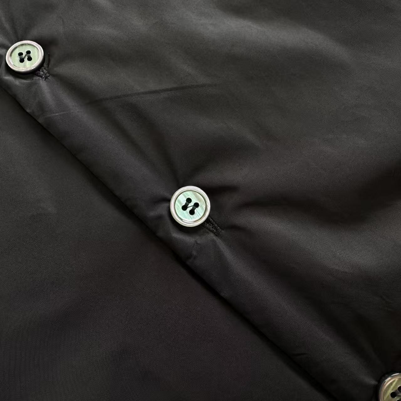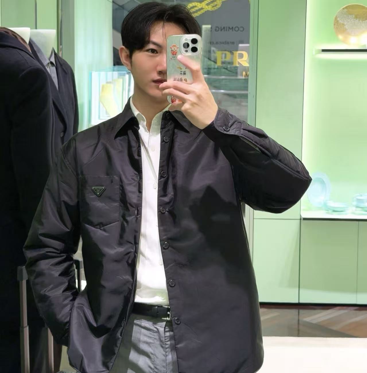 標誌性三角徽標:外套上飾有 Prada 標誌性的三角形徽標,一眼就能看出它的頂級身份,簡約卻充滿力量。