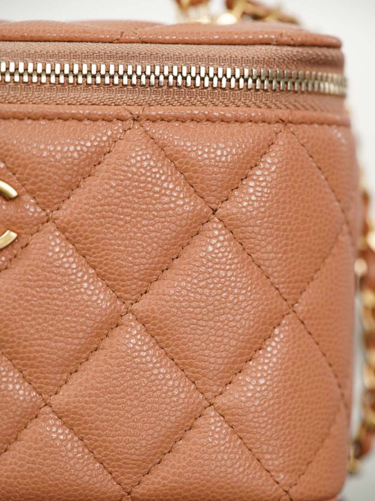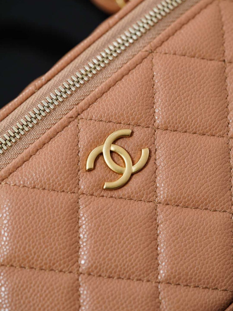 標誌性的菱格紋,加上正面雙C金屬點綴與底部立體壓印,低調又高級。手柄上幾個小雙C與皮革交織的細節,更是讓人一眼難忘,拎起瞬間就是滿滿的精緻女人味。這款化妝包使用了奢侈品級的原廠皮,讓整體質感更上一層樓。