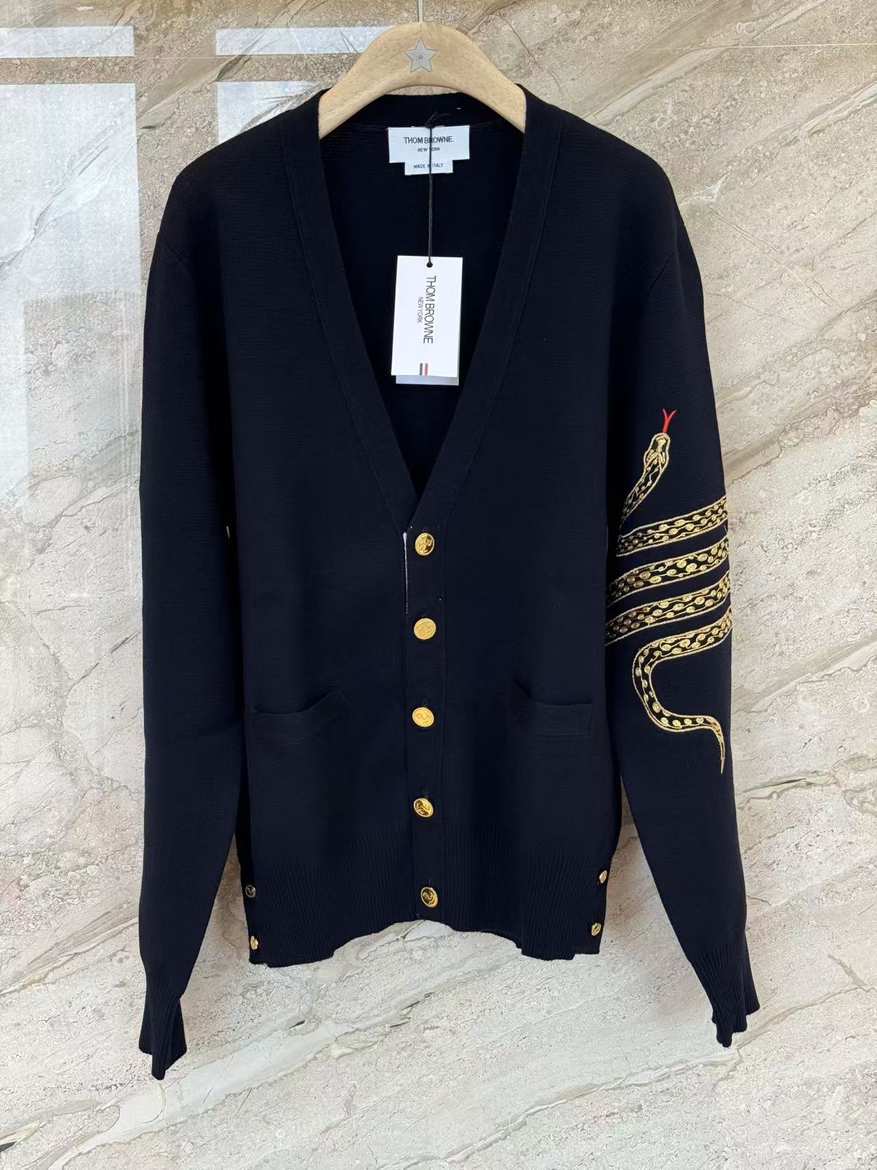 蛇年圖案:開衫巧妙地融入了蛇年的限定元素,將充滿設計感的蛇形圖案以精緻的刺繡或提花工藝呈現在羊毛衫上。這個設計不僅充滿了節日氛圍,也讓經典的 TB 開衫多了一份個性和收藏價值。