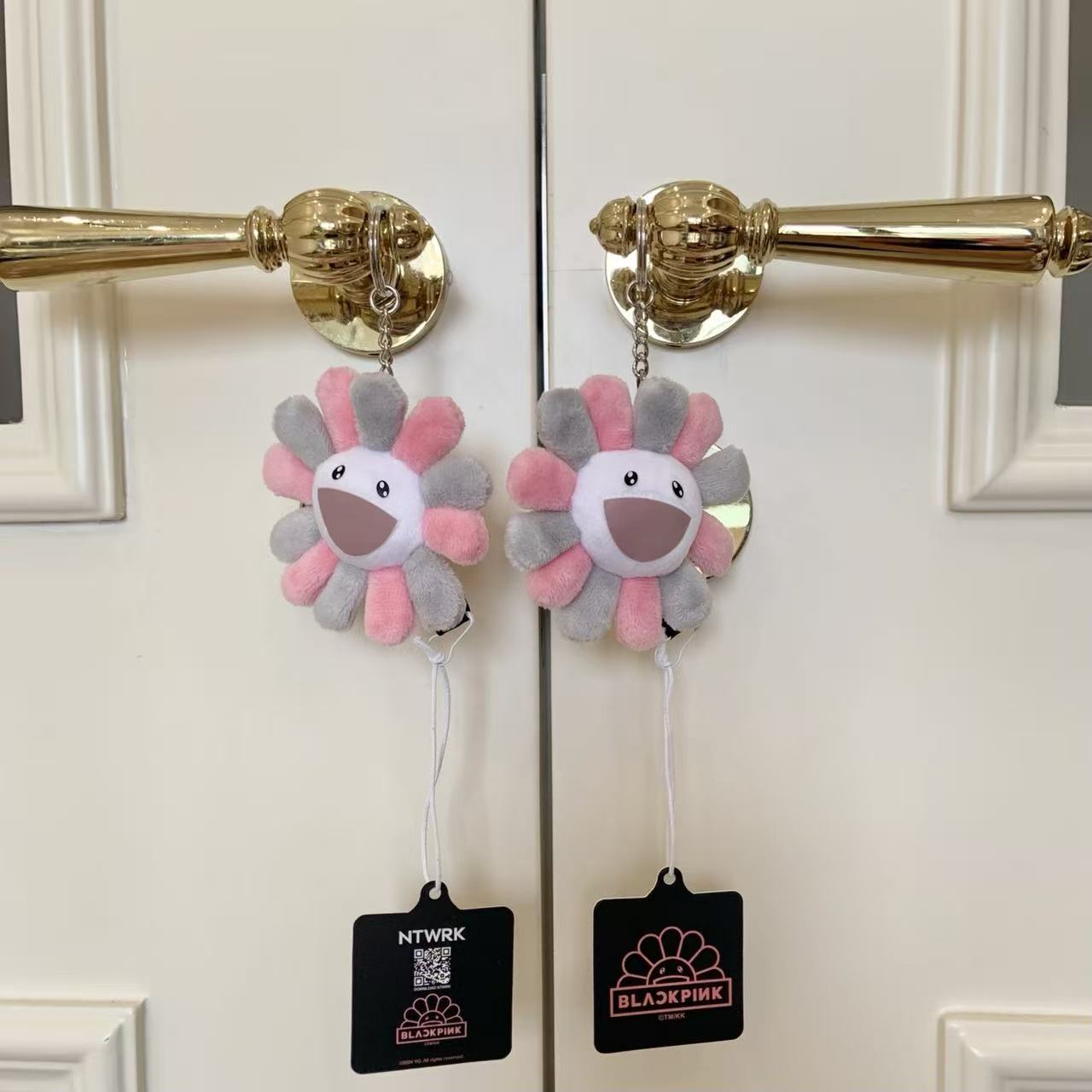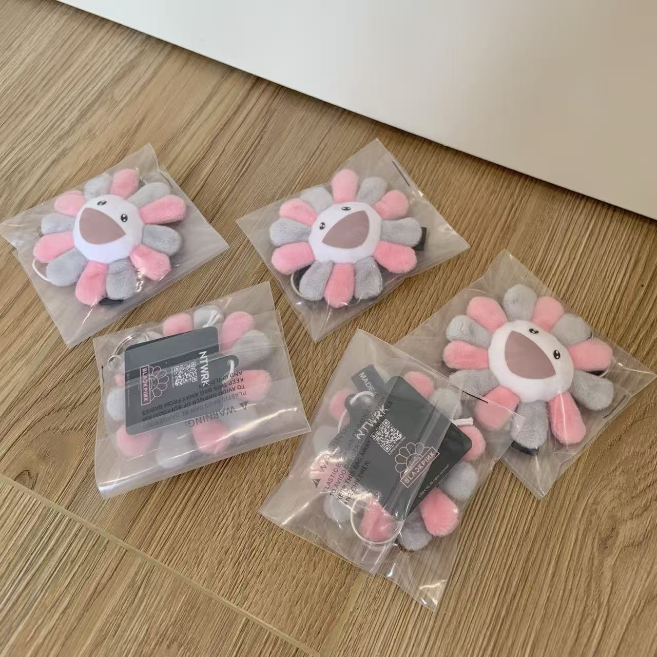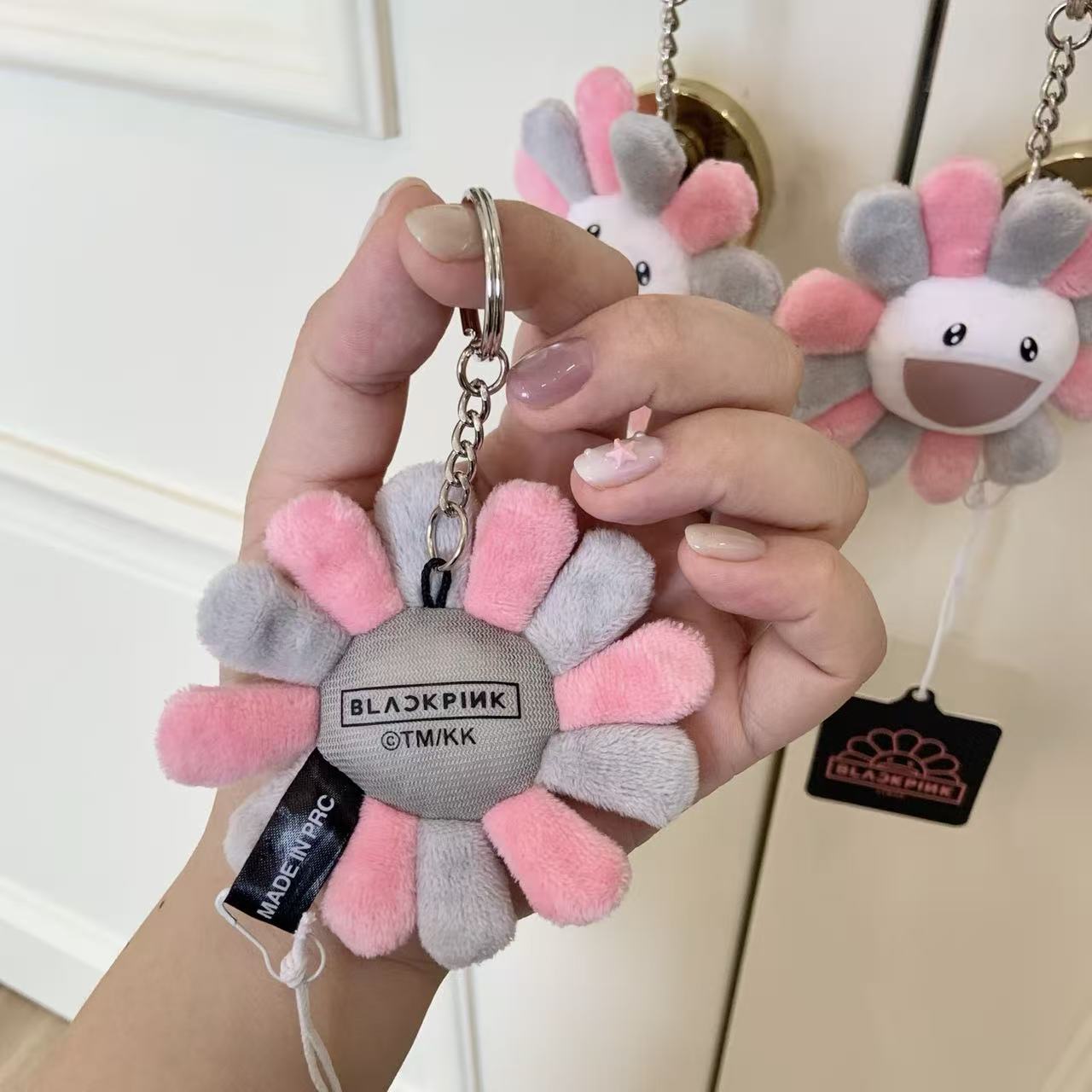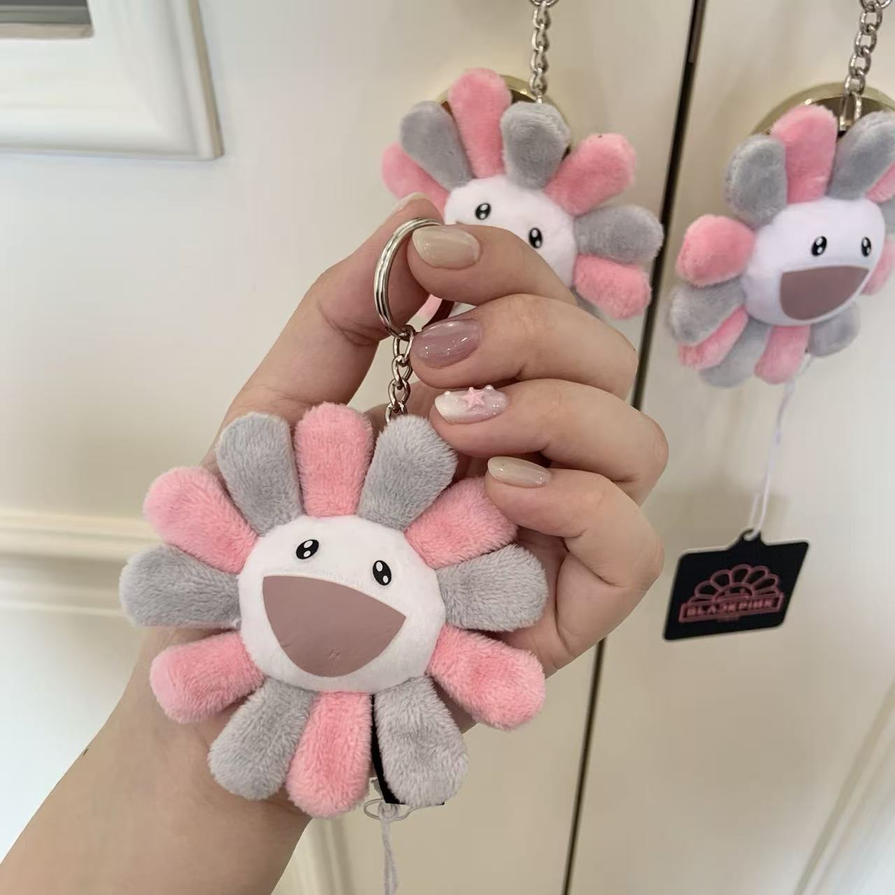 這個掛飾採用了村上隆經典的「太陽花」形象,並以灰粉配色呈現,完美地融合了 BLACKPINK 的甜酷風格與村上隆的童趣藝術。