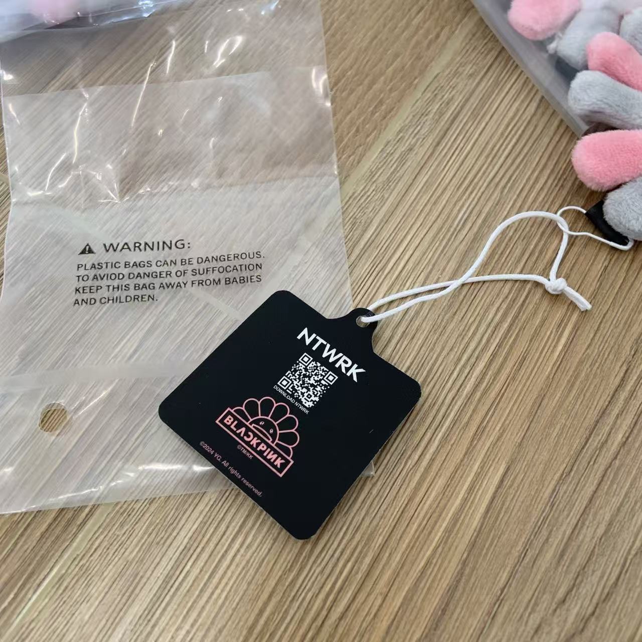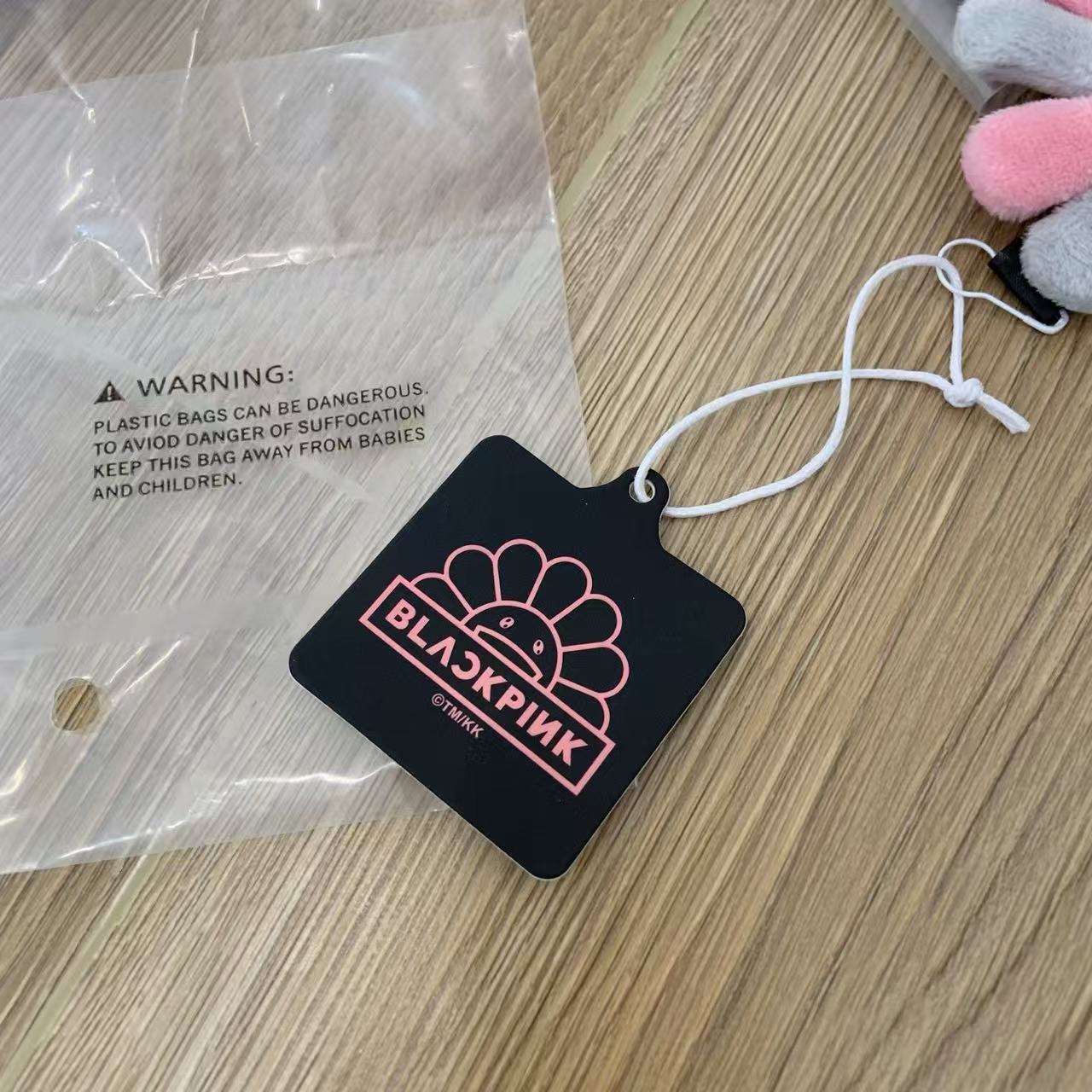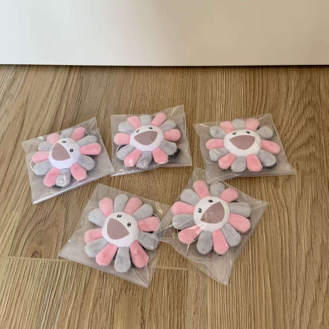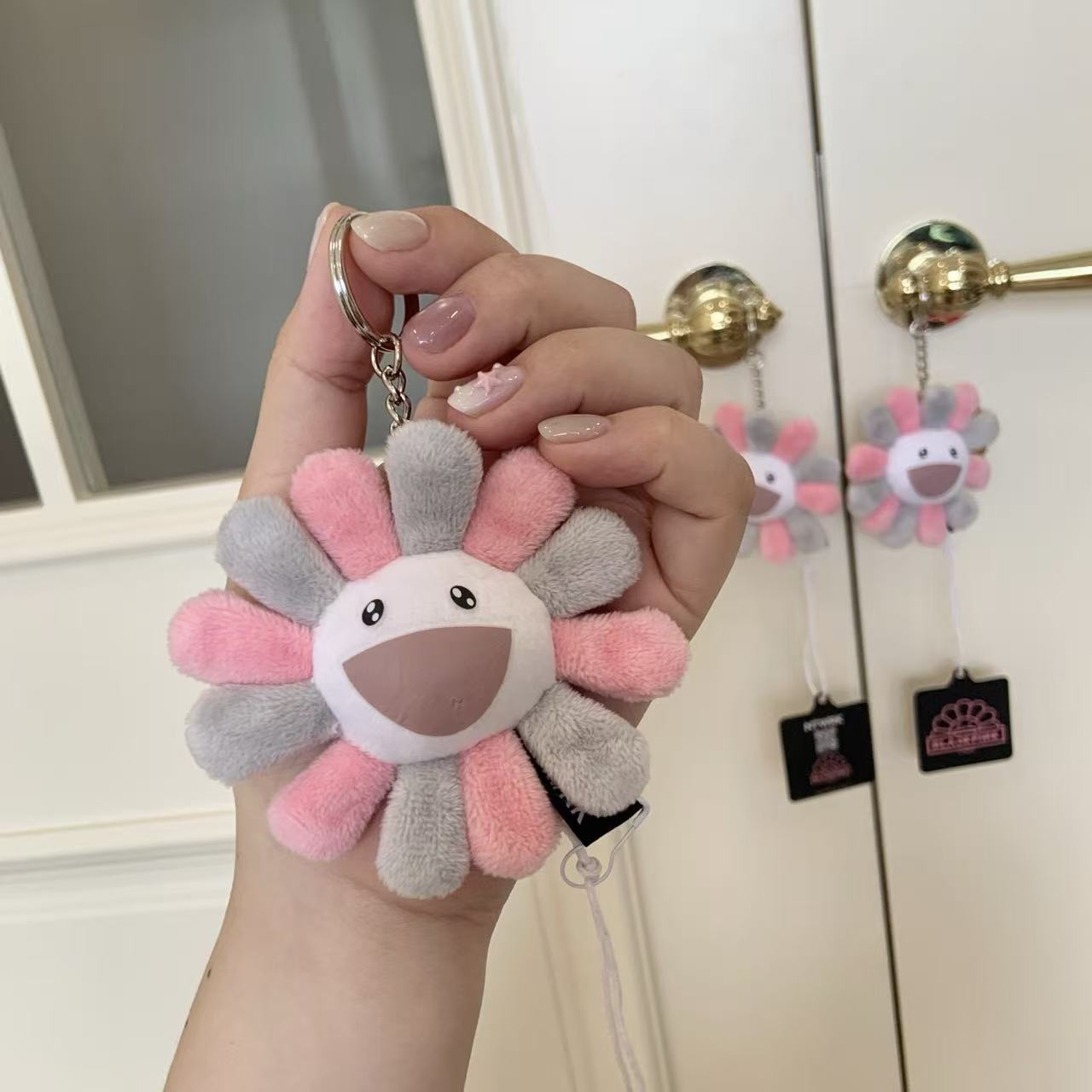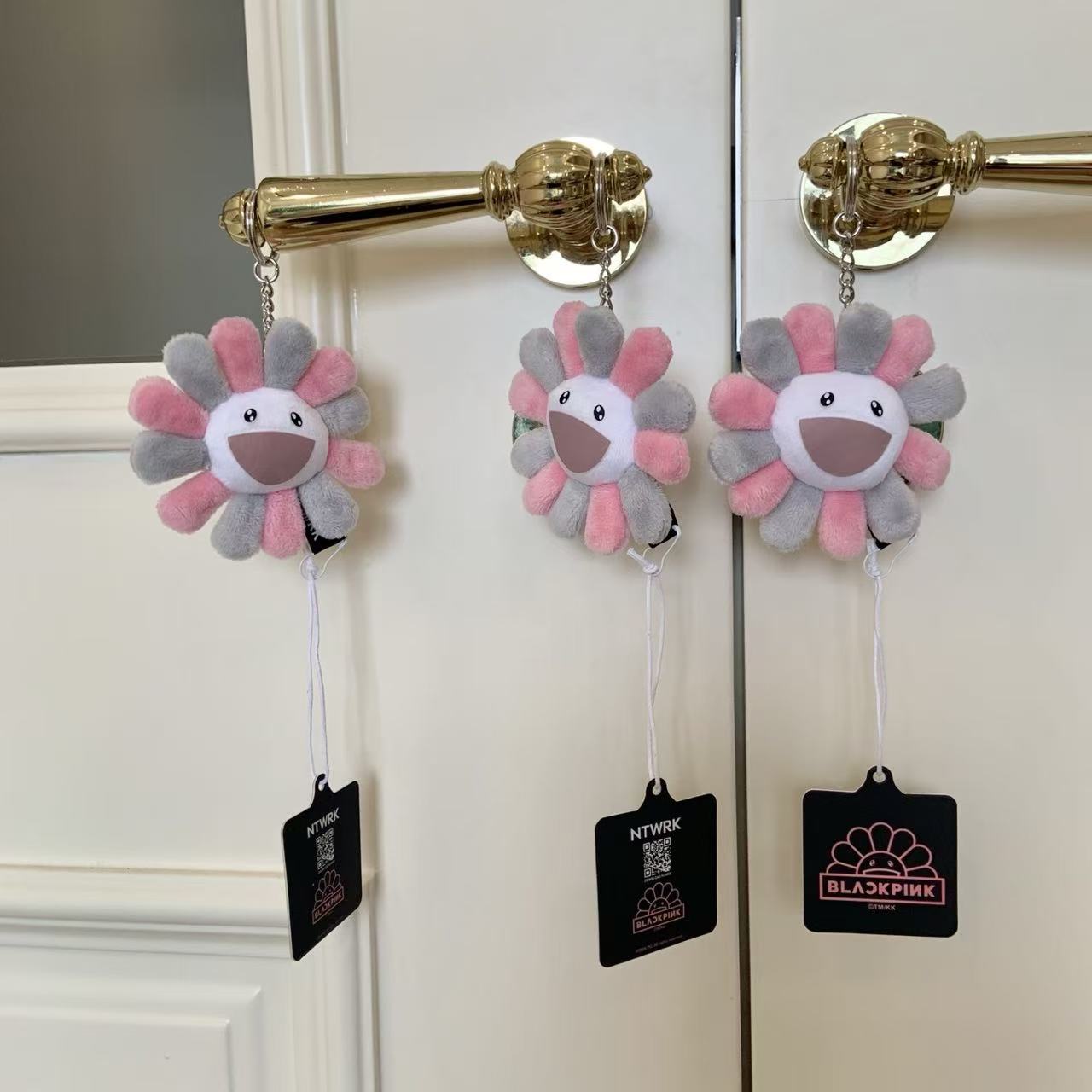 這個掛飾採用了村上隆經典的「太陽花」形象,並以灰粉配色呈現,完美地融合了 BLACKPINK 的甜酷風格與村上隆的童趣藝術。
