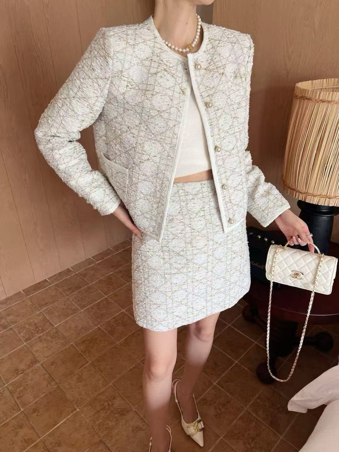 米杏色不僅襯膚顯白,還能和衣櫥裡各種單品輕鬆搭配。裙身的比例設計非常修飾身形,進口珍珠釦更是畫龍點睛,散發出剛剛好的高貴氣質。這樣的設計讓每個穿搭者都能感受到如同原單一樣的質感。