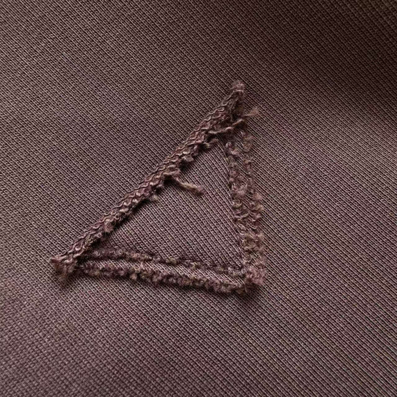 這件衛衣最吸引人的地方就是它胸前經典的品牌三角形織標!這個標誌使用了紅外線切割技術,將不同尺寸的三角形布料進行疊加,然後再用車縫固定在胸前。這種獨特的工藝,讓標誌看起來更有層次感,也完美展現了品牌的工匠精神。對於喜愛復刻與高仿的朋友來說,這樣的設計無疑是一種品味的升華。