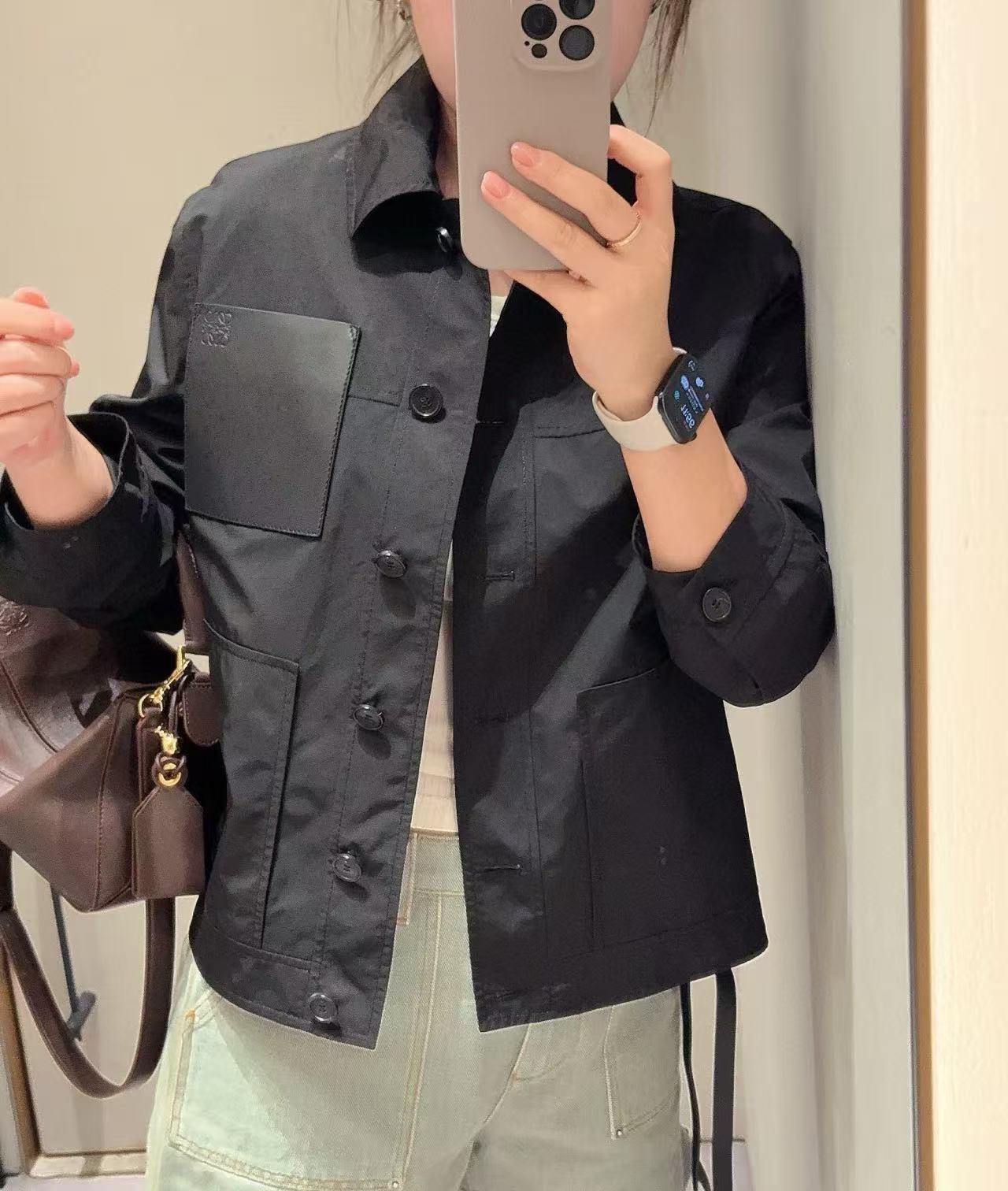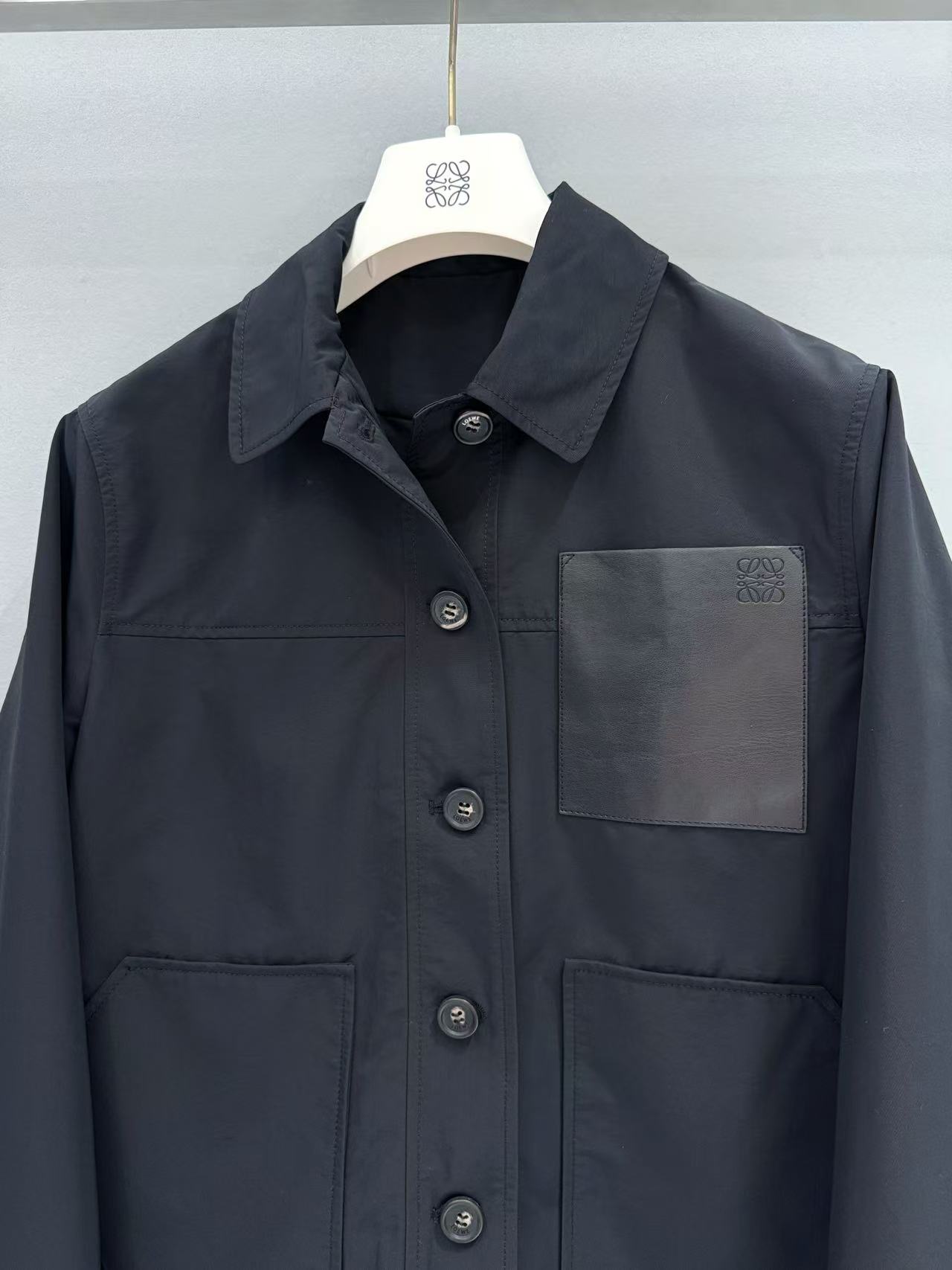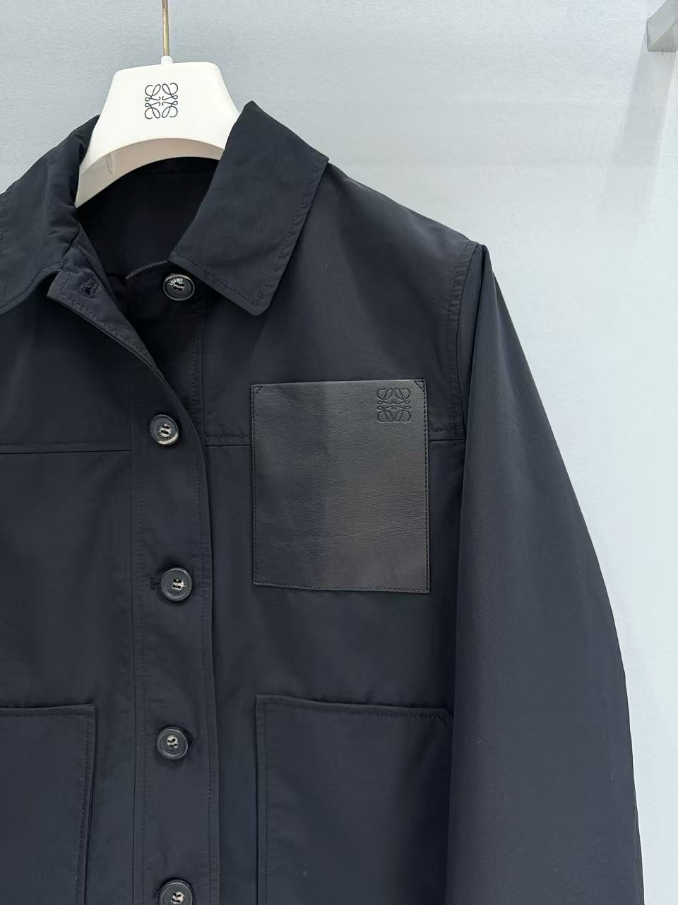 <div><div>2025早秋 Loewe 貼皮口袋外套 精品 超A</div><div><br></div><div>這件 LOEWE 外套超有型!經典前短後長剪裁,率性又帶點隨性感,不管是單穿或疊穿都很舒適。</div><div>全黑尼龍材質輕盈不沉重,翻領工裝風設計,利落剪裁非常顯氣場,胸前 Anagram 壓紋皮革貼袋更是畫龍點睛的細節。</div><div>搭配牛仔褲打造街頭率性感,配半身裙又能甜酷兼具,是秋冬必備的奢侈品。</div><div><br></div><div>材質特色</div><div>全新尼龍材質,輕盈透氣又耐穿</div><div>壓紋皮革貼袋,增加細節質感,是復刻系列中的一個亮點。</div><div>前短後長版型設計,舒適不拘束,呈現出時尚的精工設計。</div><div><br></div><div>版型細節</div><div>翻領工裝風設計</div><div>前短後長剪裁,松弛感十足,讓整個造型高仿的效果無比出色。</div><div>利落線條凸顯氣場,真的非常適合想要打造精品風格的你。</div><div><br></div><div>《尺寸規格》</div><div>S:肩寬43 胸圍54 衣長63</div><div>M:肩寬44 胸圍56 衣長64</div><div>L:肩寬45 胸圍58 衣長65</div><div><br></div><div>保養:精緻服飾保養,建議送專業乾洗店清理,切勿水洗及自行打理,以免商品損壞。</div><div><br></div><div>1~10評分</div><div>質感&舒適度:9.3</div><div><br></div><div>性價比:8.4</div><div><br></div><div>個人評語:款式好看 時髦百搭 上身氣質!</div><div><br></div><div>商品編碼:rv12541an</div><div><br></div><div>真實評價-買家秀LINE社團:<a href="https://reurl.cc/0ZO9Xb" target="_blank">https://reurl.cc/0ZO9Xb</a></div><div>(放心加入,入內可換暱稱與大頭貼,無隱私問題)</div></div>
