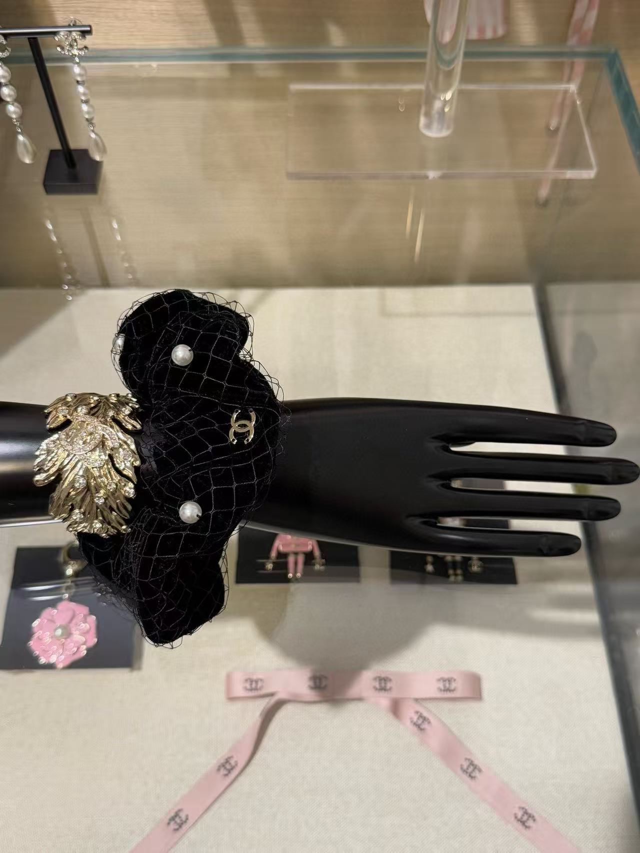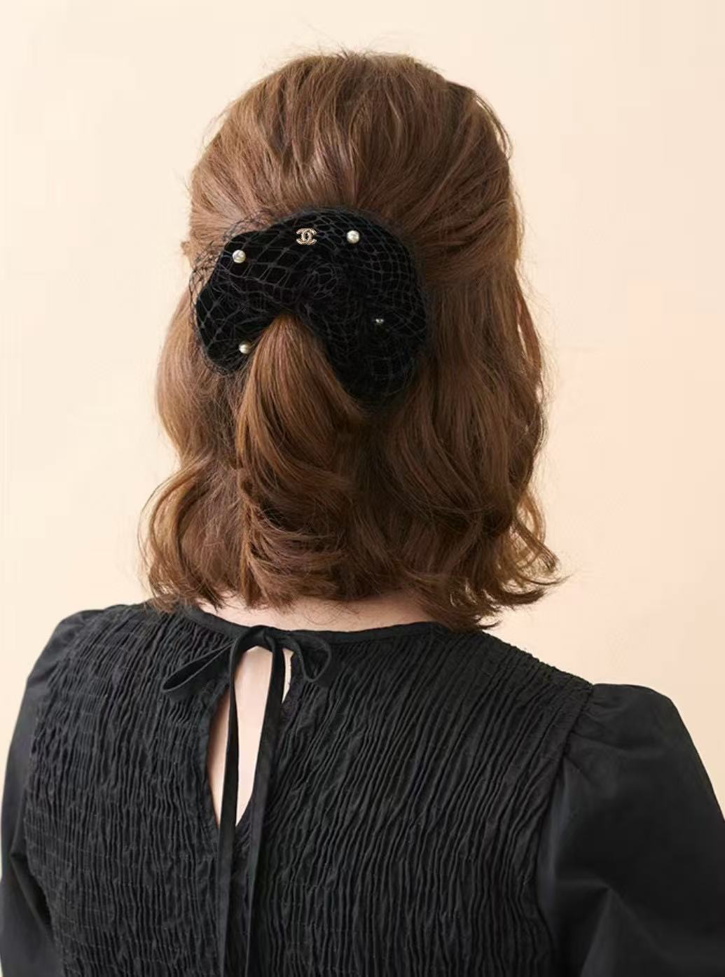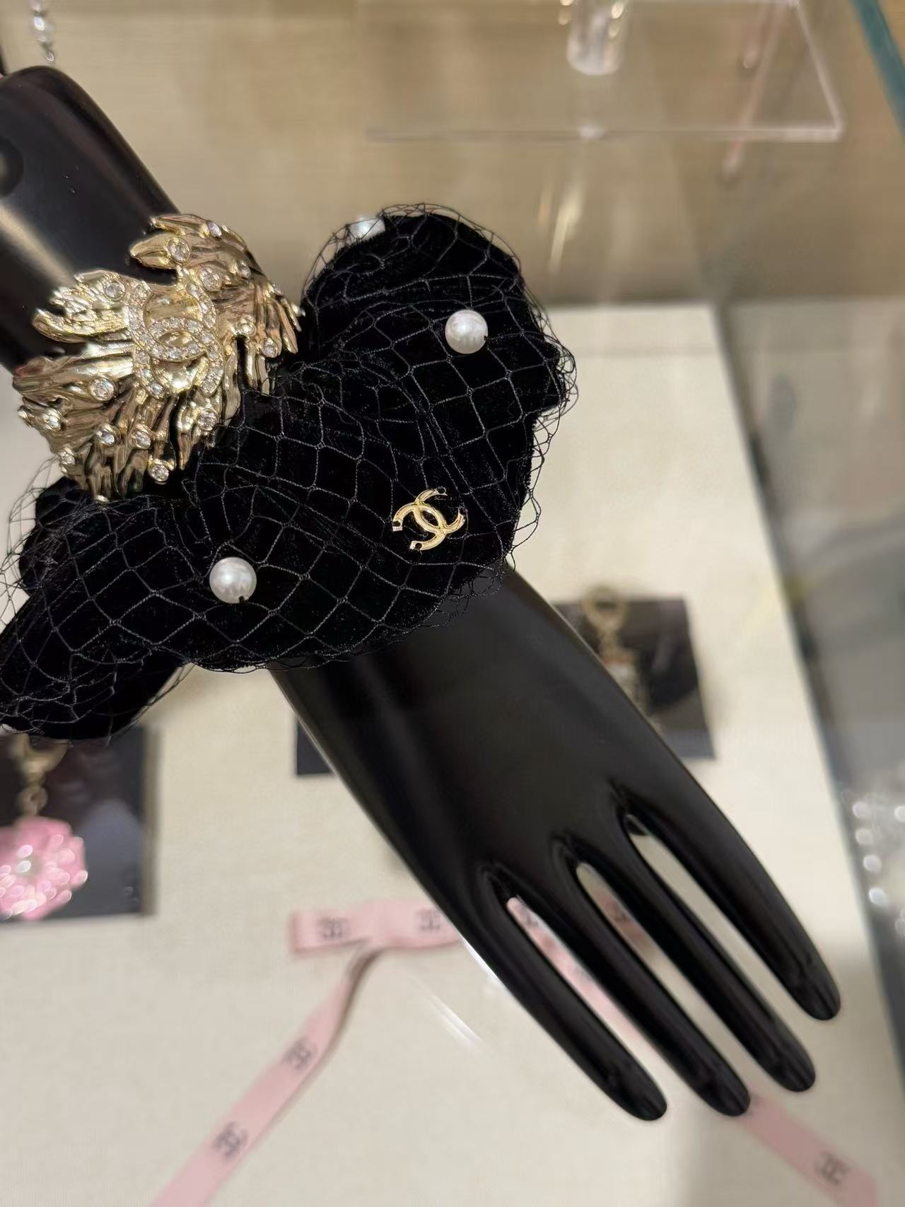 2025早秋 Chanel 黑絲絨網紗珍珠大髮圈 精品 高仿