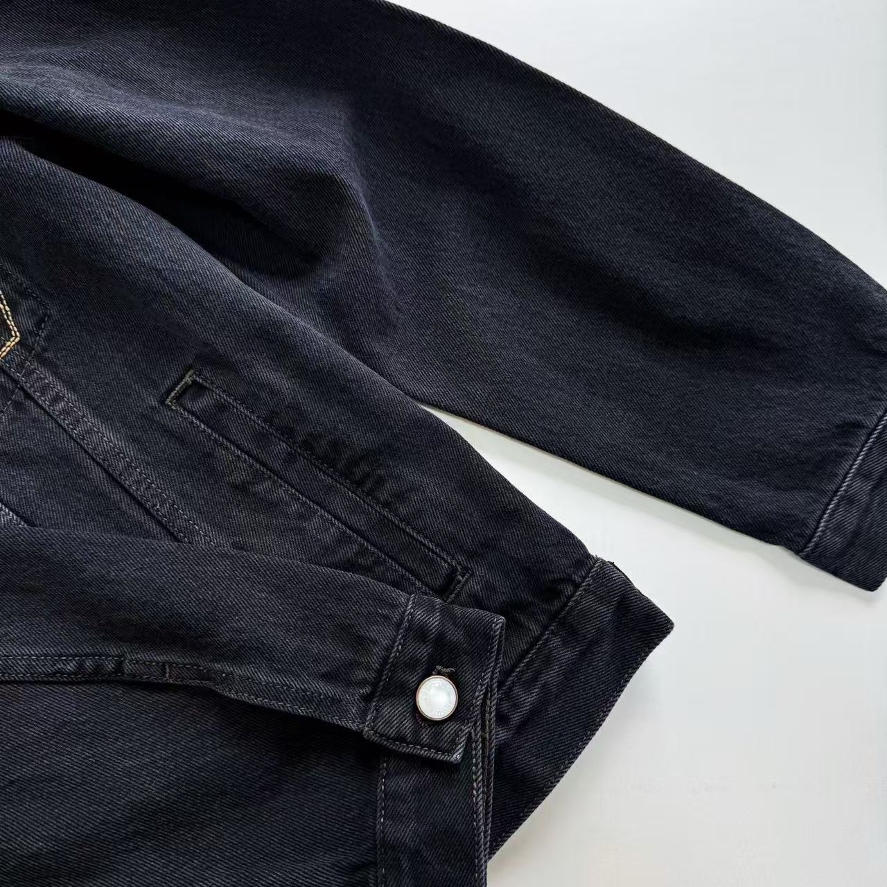 這件牛仔外套以經典斜紋牛仔布為基礎,經過特定的復古砂洗工藝,表面呈現出柔和的霜白絨毛效果,視覺上溫潤有層次,摸起來更是柔軟舒適,帶點歲月洗禮的復古韻味。外套的口袋處採用進口繡花機以萬針精繡技術打造,字母圖案線條清晰、立體感十足,散發濃濃的文藝街頭氛圍。門襟使用全新珍珠紐扣設計,紐扣刻字細膩且採用環保電鍍工藝,搭配真皮吊鉤與古銅色鏈條,後背的小牛皮皮標更是質感滿分,每一處細節都展現了品牌的用心,讓人愛不釋手!